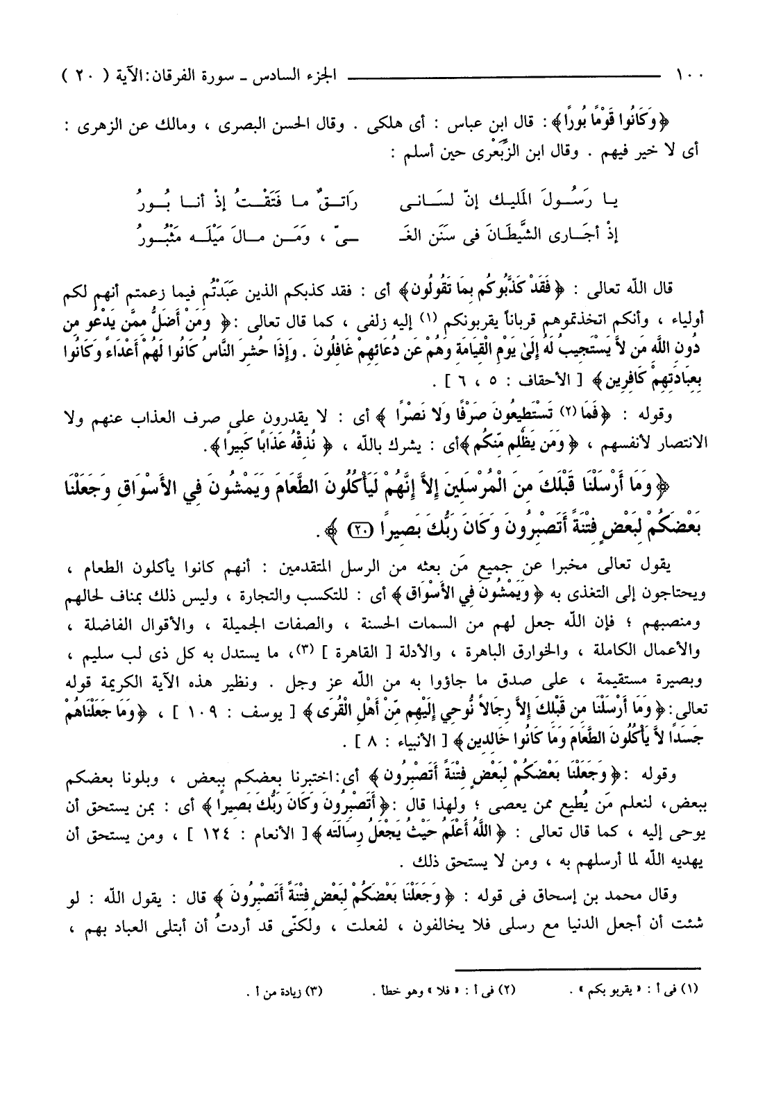 وَقَوْلُهُ: {وَجَعَلْنَا بَعْضَكُمْ لِبَعْضٍ فِتْنَةً أَتَصْبِرُونَ} أَيْ: اخْتَبَرْنَا بَعْضَكُمْ بِبَعْضٍ، وَبَلَوْنَا بَعْضَكُمْ بِبَعْضٍ، لِنَعْلَمَ مَن يُطيع مِمَّنْ يَعْصِي؛ وَلِهَذَا قَالَ: {أَتَصْبِرُونَ وَكَانَ رَبُّكَ بَصِيرًا} أَيْ: بِمَنْ يَسْتَحِقُّ أَنْ يُوحَى إِلَيْهِ، كَمَا قَالَ تَعَالَى: {اللَّهُ أَعْلَمُ حَيْثُ يَجْعَلُ رِسَالَتَهُ} [الْأَنْعَامِ: 124] ، وَمَنْ يَسْتَحِقُّ أَنْ يَهْدِيَهُ اللَّهُ لِمَا أَرْسَلَهُمْ بِهِ، وَمَنْ لَا يَسْتَحِقُّ ذَلِكَ.