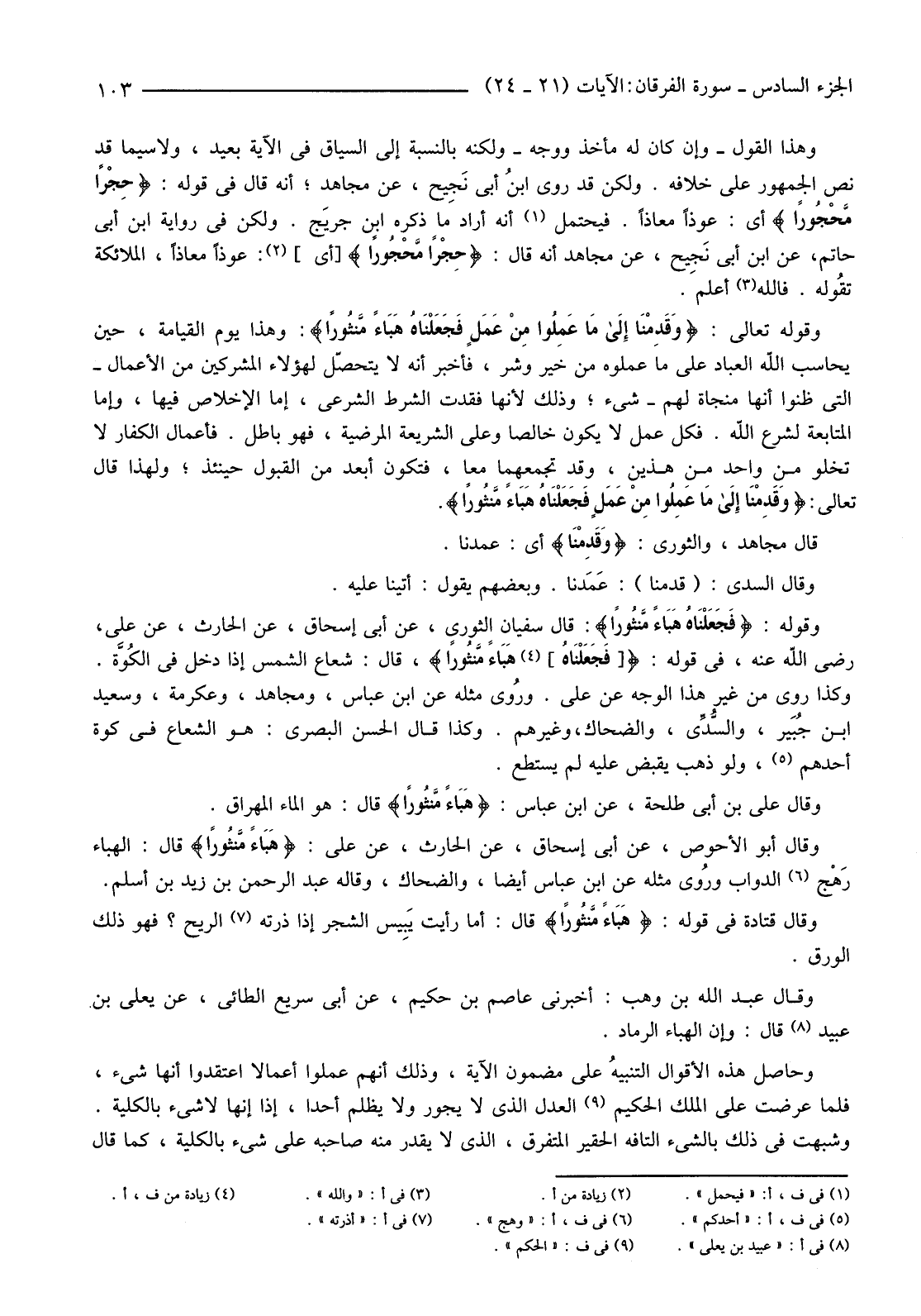 وَقَوْلُهُ: {فَجَعَلْنَاهُ هَبَاءً مَنْثُورًا} قَالَ سُفْيَانُ الثَّوْرِيُّ، عَنْ أَبِي إِسْحَاقَ، عَنِ الْحَارِثِ، عَنْ عَلِيٍّ، رَضِيَ اللَّهُ عَنْهُ، فِي قَوْلِهِ: { [فَجَعَلْنَاهُ] (4) هَبَاءً مَنْثُورًا} ، قَالَ: شُعَاعُ الشَّمْسِ إِذَا دَخَلَ فِي الكوَّة. وَكَذَا رُوِيَ مِنْ غَيْرِ هَذَا الْوَجْهِ عَنْ عَلَيٍّ. ورُوي مِثْلُهُ عَنِ ابْنِ عَبَّاسٍ، وَمُجَاهِدٍ، وَعِكْرِمَةَ، وَسَعِيدِ بْنِ جُبَير، والسُّدِّي، وَالضَّحَّاكِ، وَغَيْرِهِمْ. وَكَذَا قَالَ الْحَسَنُ الْبَصْرِيُّ: هُوَ الشُّعَاعُ فِي كُوَّةِ أَحَدِهِمْ (5) ، وَلَوْ ذَهَبَ يَقْبِضُ عَلَيْهِ لَمْ يَسْتَطِعْ.