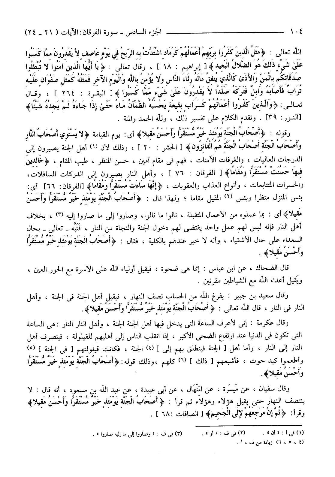وَقَوْلُهُ: {أَصْحَابُ الْجَنَّةِ يَوْمَئِذٍ خَيْرٌ مُسْتَقَرًّا وَأَحْسَنُ مَقِيلا} أَيْ: يَوْمَ الْقِيَامَةِ {لَا يَسْتَوِي أَصْحَابُ النَّارِ وَأَصْحَابُ الْجَنَّةِ أَصْحَابُ الْجَنَّةِ هُمُ الْفَائِزُونَ} [الْحَشْرِ: 20] ؛ وَذَلِكَ لِأَنَّ (1) أَهْلَ الْجَنَّةِ يَصِيرُونَ إِلَى الدَّرَجَاتِ الْعَالِيَاتِ، وَالْغُرُفَاتِ الْآمِنَاتِ، فَهُمْ فِي مَقَامٍ أَمِينٍ، حَسَنِ الْمَنْظَرِ، طَيِّبِ الْمَقَامِ، {خَالِدِينَ فِيهَا حَسُنَتْ مُسْتَقَرًّا وَمُقَامًا} [الْفَرْقَانِ: 76] ، وَأَهْلُ النَّارِ يَصِيرُونَ إِلَى الدَّرَكَاتِ السَّافِلَاتِ، وَالْحَسَرَاتِ الْمُتَتَابِعَاتِ، وَأَنْوَاعِ الْعَذَابِ وَالْعُقُوبَاتِ، {إِنَّهَا سَاءَتْ مُسْتَقَرًّا وَمُقَامًا} [الْفَرْقَانِ: 66] أَيْ: بِئْسَ الْمَنْزِلُ مَنْظَرًا وَبِئْسَ (2) الْمَقِيلُ مَقَامًا؛ وَلِهَذَا قَالَ: {أَصْحَابُ الْجَنَّةِ يَوْمَئِذٍ خَيْرٌ مُسْتَقَرًّا وَأَحْسَنُ مَقِيلا} أَيْ: بِمَا عَمِلُوهُ مِنَ الْأَعْمَالِ الْمُتَقَبَّلَةِ، نَالُوا مَا نَالُوا، وَصَارُوا إِلَى مَا صَارُوا إِلَيْهِ (3) ، بِخِلَافِ أَهْلِ النَّارِ فَإِنَّهُ لَيْسَ لَهُمْ عَمَلٌ وَاحِدٌ يَقْتَضِي لَهُمْ دُخُولَ الْجَنَّةِ وَالنَّجَاةَ مِنَ النَّارِ، فَنَبَّه -تَعَالَى -بِحَالِ السُّعَدَاءِ عَلَى حَالِ الْأَشْقِيَاءِ، وَأَنَّهُ لَا خَيْرَ عِنْدَهُمْ بِالْكُلِّيَّةِ، فَقَالَ: {أَصْحَابُ الْجَنَّةِ يَوْمَئِذٍ خَيْرٌ مُسْتَقَرًّا وَأَحْسَنُ مَقِيلا} .