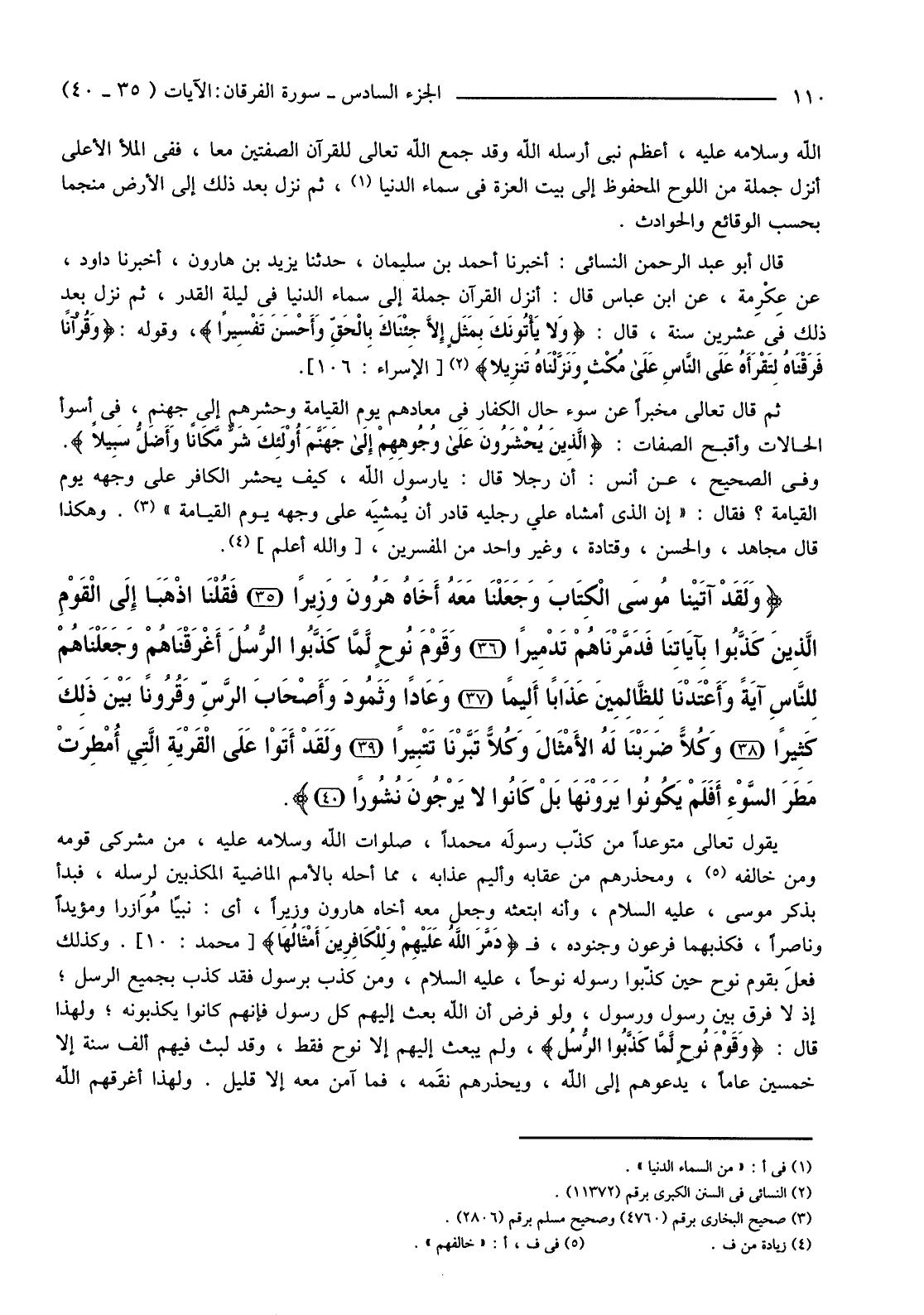 {وَلَقَدْ آتَيْنَا مُوسَى الْكِتَابَ وَجَعَلْنَا مَعَهُ أَخَاهُ هَارُونَ وَزِيرًا (35) فَقُلْنَا اذْهَبَا إِلَى الْقَوْمِ الَّذِينَ كَذَّبُوا بِآيَاتِنَا فَدَمَّرْنَاهُمْ تَدْمِيرًا (36) وَقَوْمَ نُوحٍ لَمَّا كَذَّبُوا الرُّسُلَ أَغْرَقْنَاهُمْ وَجَعَلْنَاهُمْ لِلنَّاسِ آيَةً وَأَعْتَدْنَا لِلظَّالِمِينَ عَذَابًا أَلِيمًا (37) وَعَادًا وَثَمُودَ وَأَصْحَابَ الرَّسِّ وَقُرُونًا بَيْنَ ذَلِكَ كَثِيرًا (38) وَكُلا ضَرَبْنَا لَهُ الأمْثَالَ وَكُلا تَبَّرْنَا تَتْبِيرًا (39) وَلَقَدْ أَتَوْا عَلَى الْقَرْيَةِ الَّتِي أُمْطِرَتْ مَطَرَ السَّوْءِ أَفَلَمْ يَكُونُوا يَرَوْنَهَا بَلْ كَانُوا لَا يَرْجُونَ نُشُورًا (40) }
