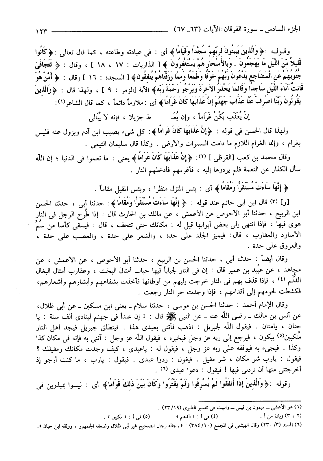 وَقَوْلُهُ: {وَالَّذِينَ يَبِيتُونَ لِرَبِّهِمْ سُجَّدًا وَقِيَامًا} أَيْ: فِي عِبَادَتِهِ وَطَاعَتِهِ، كَمَا قَالَ تَعَالَى: {كَانُوا قَلِيلا مِنَ اللَّيْلِ مَا يَهْجَعُونَ وَبِالأسْحَارِ هُمْ يَسْتَغْفِرُونَ} [الذَّارِيَاتِ: 17 -18] ، وَقَالَ {تَتَجَافَى جُنُوبُهُمْ عَنِ الْمَضَاجِعِ يَدْعُونَ رَبَّهُمْ خَوْفًا وَطَمَعًا وَمِمَّا رَزَقْنَاهُمْ يُنْفِقُونَ} [السَّجْدَةِ: 16] وَقَالَ {أَمَّنْ هُوَ قَانِتٌ آنَاءَ اللَّيْلِ سَاجِدًا وَقَائِمًا يَحْذَرُ الآخِرَةَ وَيَرْجُو رَحْمَةَ رَبِّهِ} الْآيَةَ [الزُّمَرِ: 9] وَلِهَذَا قَالَ: {وَالَّذِينَ يَقُولُونَ رَبَّنَا اصْرِفْ عَنَّا عَذَابَ جَهَنَّمَ إِنَّ عَذَابَهَا كَانَ غَرَامًا} أَيْ: مُلَازِمًا دَائِمًا، كَمَا قَالَ الشَّاعِرُ (1) :