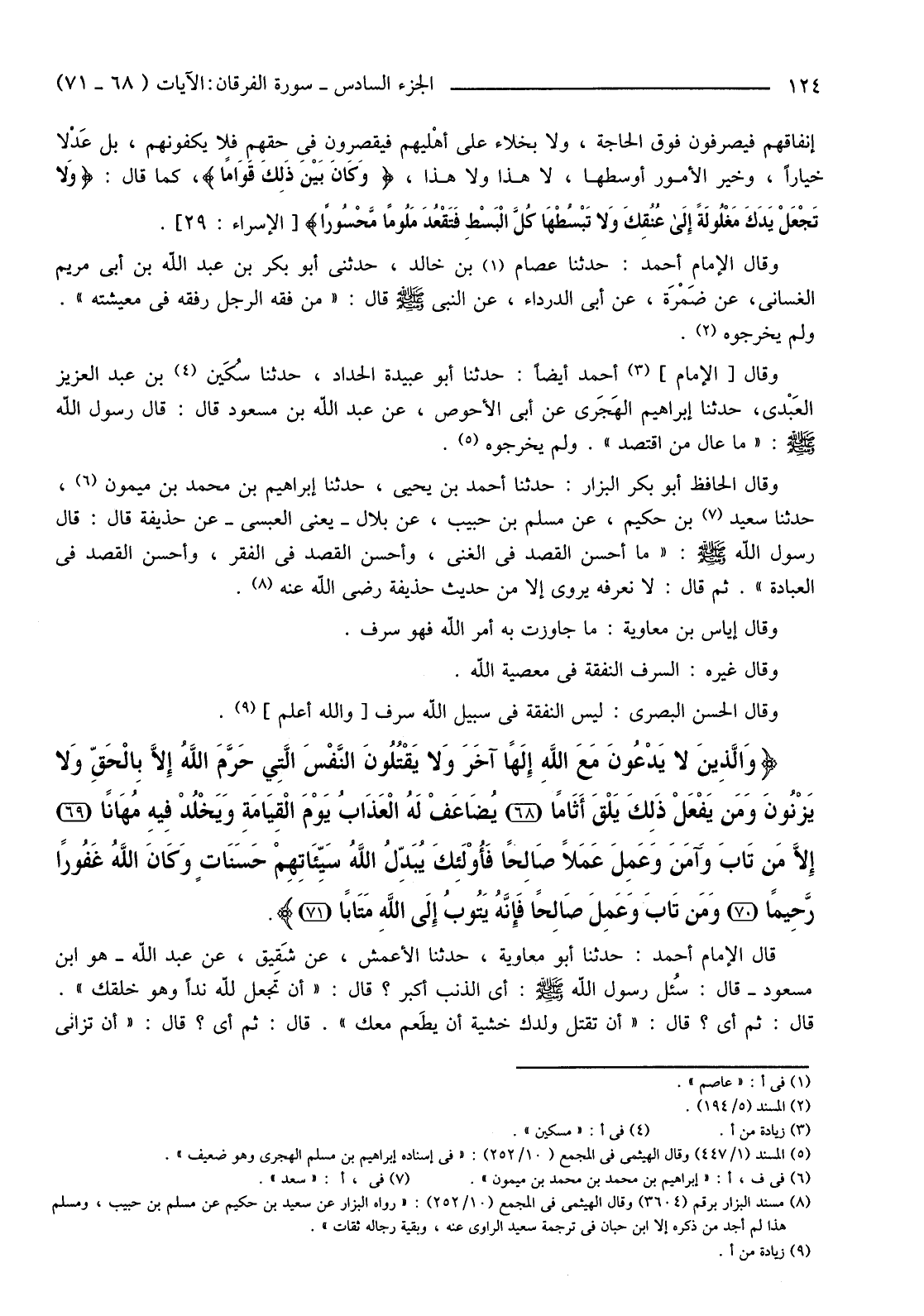 {وَالَّذِينَ لَا يَدْعُونَ مَعَ اللَّهِ إِلَهًا آخَرَ وَلا يَقْتُلُونَ النَّفْسَ الَّتِي حَرَّمَ اللَّهُ إِلا بِالْحَقِّ وَلا يَزْنُونَ وَمَنْ يَفْعَلْ ذَلِكَ يَلْقَ أَثَامًا (68) يُضَاعَفْ لَهُ الْعَذَابُ يَوْمَ الْقِيَامَةِ وَيَخْلُدْ فِيهِ مُهَانًا (69) إِلا مَنْ تَابَ وَآمَنَ وَعَمِلَ عَمَلا صَالِحًا فَأُولَئِكَ يُبَدِّلُ اللَّهُ سَيِّئَاتِهِمْ حَسَنَاتٍ وَكَانَ اللَّهُ غَفُورًا رَحِيمًا (70) وَمَنْ تَابَ وَعَمِلَ صَالِحًا فَإِنَّهُ يَتُوبُ إِلَى اللَّهِ مَتَابًا (71) } .