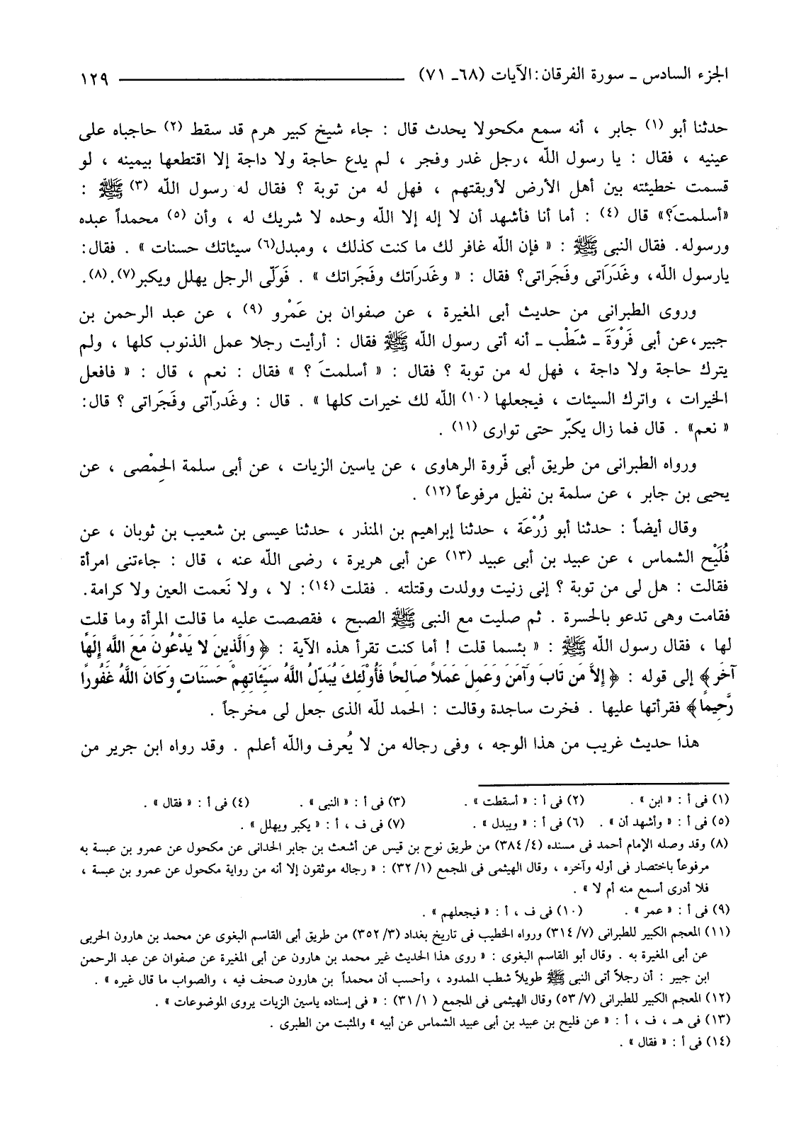 (11) المعجم الكبير للطبراني (7/314) ورواه الخطيب في تاريخ بغداد (3/352) من طريق أبي القاسم البغوي عن محمد بن هارون الحربي عن أبي المغيرة به. وقال أبو القاسم البغوي: "روى هذا الحديث غير محمد بن هارون عن أبي المغيرة عن صفوان عن عبد الرحمن بن جبير: أَنَّ رَجُلًا أَتَى النَّبِيَّ صَلَّى اللَّهُ عَلَيْهِ وسلم طويلا شطب الممدود، وأحسب أن محمد بن هارون صحف فيه، والصواب ما قال غيره".