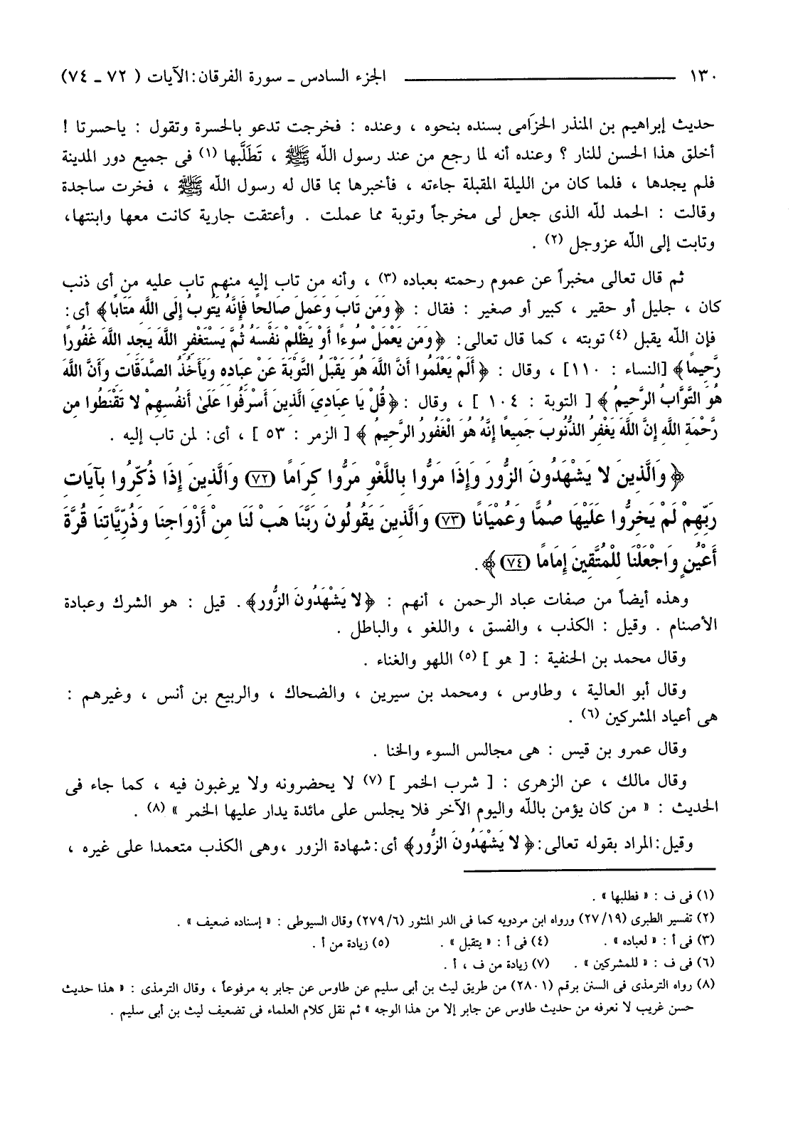 {وَالَّذِينَ لَا يَشْهَدُونَ الزُّورَ وَإِذَا مَرُّوا بِاللَّغْوِ مَرُّوا كِرَامًا (72) وَالَّذِينَ إِذَا ذُكِّرُوا بِآيَاتِ رَبِّهِمْ لَمْ يَخِرُّوا عَلَيْهَا صُمًّا وَعُمْيَانًا (73) وَالَّذِينَ يَقُولُونَ رَبَّنَا هَبْ لَنَا مِنْ أَزْوَاجِنَا وَذُرِّيَّاتِنَا قُرَّةَ أَعْيُنٍ وَاجْعَلْنَا لِلْمُتَّقِينَ إِمَامًا (74) }