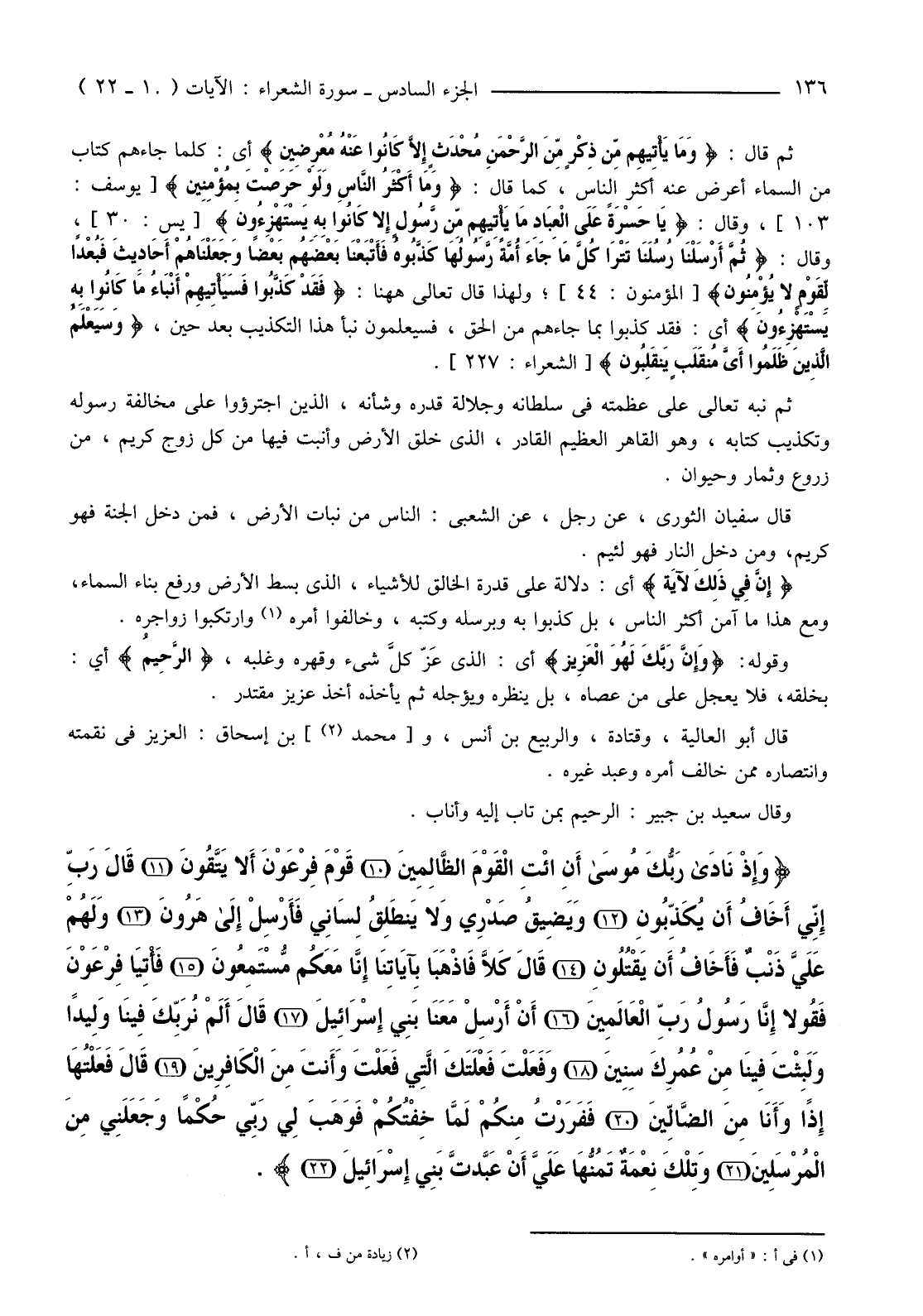 {وَإِذْ نَادَى رَبُّكَ مُوسَى أَنِ ائْتِ الْقَوْمَ الظَّالِمِينَ (10) قَوْمَ فِرْعَوْنَ أَلا يَتَّقُونَ (11) قَالَ رَبِّ إِنِّي أَخَافُ أَنْ يُكَذِّبُونِ (12) وَيَضِيقُ صَدْرِي وَلا يَنْطَلِقُ لِسَانِي فَأَرْسِلْ إِلَى هَارُونَ (13) وَلَهُمْ عَلَيَّ ذَنْبٌ فَأَخَافُ أَنْ يَقْتُلُونِ (14) قَالَ كَلا فَاذْهَبَا بِآيَاتِنَا إِنَّا مَعَكُمْ مُسْتَمِعُونَ (15) فَأْتِيَا فِرْعَوْنَ فَقُولا إِنَّا رَسُولُ رَبِّ الْعَالَمِينَ (16) أَنْ أَرْسِلْ مَعَنَا بَنِي إِسْرَائِيلَ (17) قَالَ أَلَمْ نُرَبِّكَ فِينَا وَلِيدًا وَلَبِثْتَ فِينَا مِنْ عُمُرِكَ سِنِينَ (18) وَفَعَلْتَ فَعْلَتَكَ الَّتِي فَعَلْتَ وَأَنْتَ مِنَ الْكَافِرِينَ (19) }