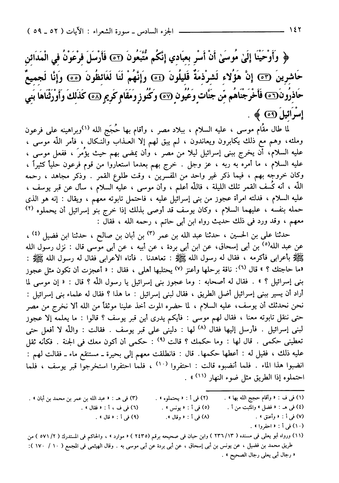 حدَّثنا عَلِيُّ بْنُ الْحُسَيْنِ، حَدَّثَنَا عَبْدُ اللَّهِ بْنُ عُمَرَ (3) بْنِ أَبَانِ بْنِ صَالِحٍ، حَدَّثَنَا ابْنُ فُضَيْلٍ (4) عَنْ عَبْدِ اللَّهِ (5) بْنِ أَبِي إِسْحَاقَ، عَنِ ابْنِ أَبِي بُرْدَةَ، عَنْ أَبِيهِ، عَنْ أَبِي مُوسَى قَالَ: نَزَلَ رَسُولُ اللَّهِ صَلَّى اللَّهُ عَلَيْهِ وَسَلَّمَ بِأَعْرَابِيٍّ فَأَكْرَمَهُ، فَقَالَ لَهُ رَسُولُ اللَّهِ صَلَّى اللَّهُ عَلَيْهِ وَسَلَّمَ: تَعَاهَدْنَا. فَأَتَاهُ الْأَعْرَابِيُّ فَقَالَ لَهُ رَسُولُ اللَّهِ صَلَّى اللَّهُ عَلَيْهِ وَسَلَّمَ: "مَا حَاجَتُكَ؟ " قَالَ (6) نَاقَةٌ بِرَحْلِهَا وَأَعْنُزٌ (7) يَحْتَلِبُهَا أَهْلِي، فَقَالَ: "أَعْجَزْتَ أَنْ تَكُونَ مِثْلَ عَجُوزِ بَنِي إِسْرَائِيلَ؟ " فَقَالَ لَهُ أَصْحَابُهُ: وَمَا عَجُوزُ بَنِي إِسْرَائِيلَ يَا رَسُولَ اللَّهِ؟ قَالَ: "إِنَّ مُوسَى لَمَّا أَرَادَ أَنْ يَسِيرَ بِبَنِي إِسْرَائِيلَ أَضَلَّ الطَّرِيقَ، فَقَالَ لِبَنِي إِسْرَائِيلَ: مَا هَذَا؟ فَقَالَ لَهُ عُلَمَاءُ بَنِي إِسْرَائِيلَ: نَحْنُ نحِّدثك أَنَّ يُوسُفَ عَلَيْهِ السَّلَامُ لَمَّا حَضَرَهُ الْمَوْتُ أَخَذَ عَلَيْنَا مَوْثِقًا مِنَ اللَّهِ أَلَّا نَخْرُجَ مِنْ مِصْرَ حَتَّى نَنْقُلَ تَابُوتَهُ مَعَنَا، فَقَالَ لَهُمْ مُوسَى: فَأَيُّكُمْ يَدْرِي أَيْنَ قَبْرُ يُوسُفَ؟ قَالُوا: مَا يَعْلَمُهُ إِلَّا عَجُوزٌ لِبَنِي إِسْرَائِيلَ. فَأَرْسَلَ إِلَيْهَا فَقَالَ (8) لَهَا: دُلِّينِي عَلَى قَبْرِ يُوسُفَ. فَقَالَتْ: وَاللَّهِ لَا أَفْعَلُ حَتَّى تُعْطِيَنِي حُكْمِي. قَالَ لَهَا: وَمَا حُكْمُكِ؟ قَالَتْ (9) : حُكْمِي أَنْ أَكُونَ مَعَكَ فِي الْجَنَّةِ. فَكَأَنَّهُ ثَقُلَ عَلَيْهِ ذَلِكَ، فَقِيلَ لَهُ: أَعْطِهَا حُكْمَهَا. قَالَ: فَانْطَلَقَتْ مَعَهُمْ إِلَى بُحَيْرَةٍ -مُسْتَنْقَعِ مَاءٍ -فَقَالَتْ لَهُمْ: أَنْضِبُوا هَذَا الْمَاءَ. فَلَمَّا أَنْضَبُوهُ قَالَتِ: احْتَفِرُوا، (10) فَلَمَّا احْتَفَرُوا اسْتَخْرَجُوا قَبْرَ يُوسُفَ، فَلَمَّا احْتَمَلُوهُ إِذَا الطَّرِيقُ مِثْلَ ضَوْءِ النهار (11) ".