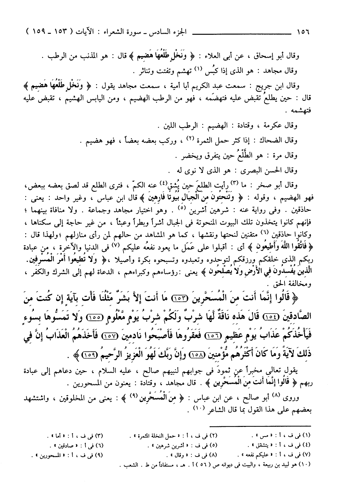 {قَالُوا إِنَّمَا أَنْتَ مِنَ الْمُسَحَّرِينَ (153) مَا أَنْتَ إِلا بَشَرٌ مِثْلُنَا فَأْتِ بِآيَةٍ إِنْ كُنْتَ مِنَ الصَّادِقِينَ (154) قَالَ هَذِهِ نَاقَةٌ لَهَا شِرْبٌ وَلَكُمْ شِرْبُ يَوْمٍ مَعْلُومٍ (155) وَلا تَمَسُّوهَا بِسُوءٍ فَيَأْخُذَكُمْ عَذَابُ يَوْمٍ عَظِيمٍ (156) فَعَقَرُوهَا فَأَصْبَحُوا نَادِمِينَ (157) فَأَخَذَهُمُ الْعَذَابُ إِنَّ فِي ذَلِكَ لآيَةً وَمَا كَانَ أَكْثَرُهُمْ مُؤْمِنِينَ (158) وَإِنَّ رَبَّكَ لَهُوَ الْعَزِيزُ الرَّحِيمُ (159) }