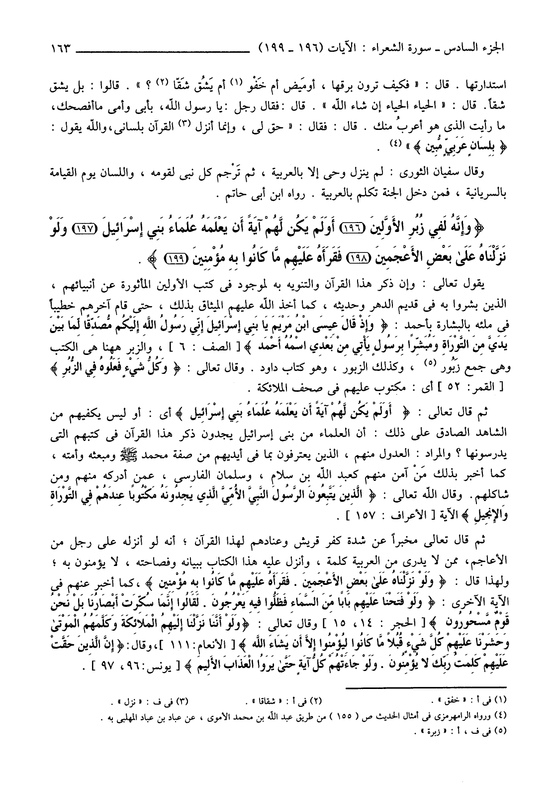 {وَإِنَّهُ لَفِي زُبُرِ الأوَّلِينَ (196) أَوَلَمْ يَكُنْ لَهُمْ آيَةً أَنْ يَعْلَمَهُ عُلَمَاءُ بَنِي إِسْرَائِيلَ (197) وَلَوْ نزلْنَاهُ عَلَى بَعْضِ الأعْجَمِينَ (198) فَقَرَأَهُ عَلَيْهِمْ مَا كَانُوا بِهِ مُؤْمِنِينَ (199) } .