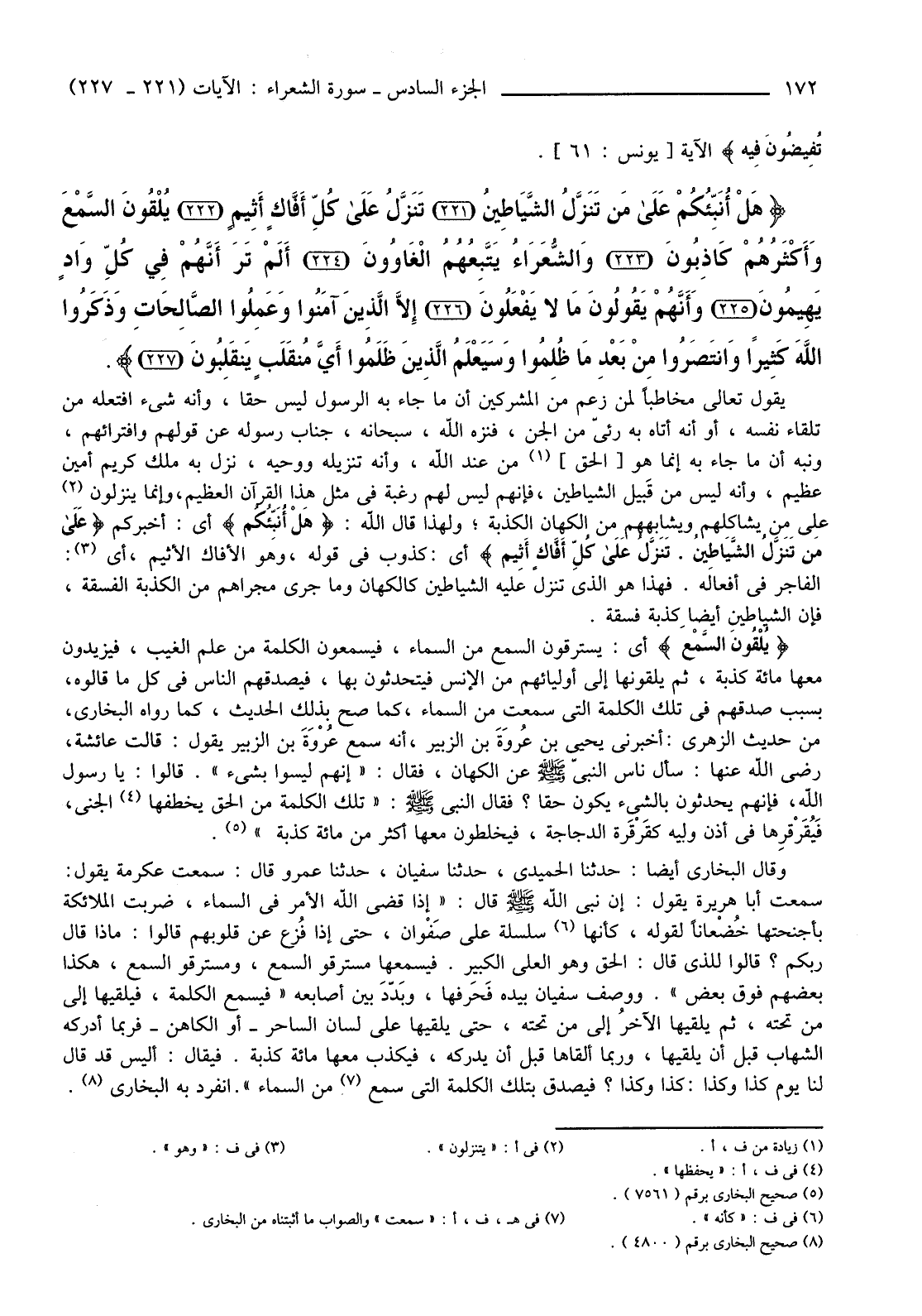 {هَلْ أُنَبِّئُكُمْ عَلَى مَنْ تَنزلُ الشَّيَاطِينُ (221) تَنزلُ عَلَى كُلِّ أَفَّاكٍ أَثِيمٍ (222) يُلْقُونَ السَّمْعَ وَأَكْثَرُهُمْ كَاذِبُونَ (223) وَالشُّعَرَاءُ يَتَّبِعُهُمُ الْغَاوُونَ (224) أَلَمْ تَرَ أَنَّهُمْ فِي كُلِّ وَادٍ يَهِيمُونَ (225) وَأَنَّهُمْ يَقُولُونَ مَا لَا يَفْعَلُونَ (226) إِلا الَّذِينَ آمَنُوا وَعَمِلُوا الصَّالِحَاتِ وَذَكَرُوا اللَّهَ كَثِيرًا وَانْتَصَرُوا مِنْ بَعْدِ مَا ظُلِمُوا وَسَيَعْلَمُ الَّذِينَ ظَلَمُوا أَيَّ مُنْقَلَبٍ يَنْقَلِبُونَ (227) } .