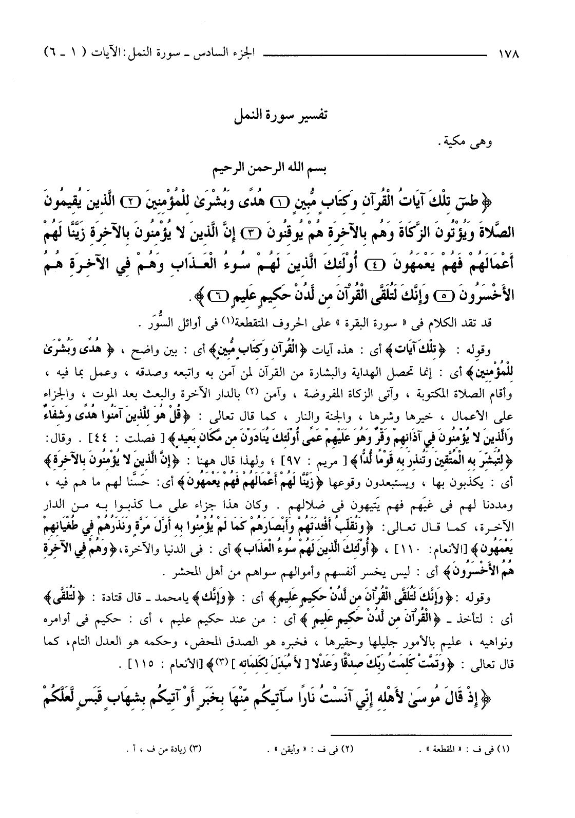 {طس تِلْكَ آيَاتُ الْقُرْآنِ وَكِتَابٍ مُبِينٍ (1) هُدًى وَبُشْرَى لِلْمُؤْمِنِينَ (2) الَّذِينَ يُقِيمُونَ الصَّلاةَ وَيُؤْتُونَ الزَّكَاةَ وَهُمْ بِالآخِرَةِ هُمْ يُوقِنُونَ (3) إِنَّ الَّذِينَ لَا يُؤْمِنُونَ بِالآخِرَةِ زَيَّنَّا لَهُمْ أَعْمَالَهُمْ فَهُمْ يَعْمَهُونَ (4) أُولَئِكَ الَّذِينَ لَهُمْ سُوءُ الْعَذَابِ وَهُمْ فِي الآخِرَةِ هُمُ الأخْسَرُونَ (5) وَإِنَّكَ لَتُلَقَّى الْقُرْآنَ مِنْ لَدُنْ حَكِيمٍ عَلِيمٍ (6) }