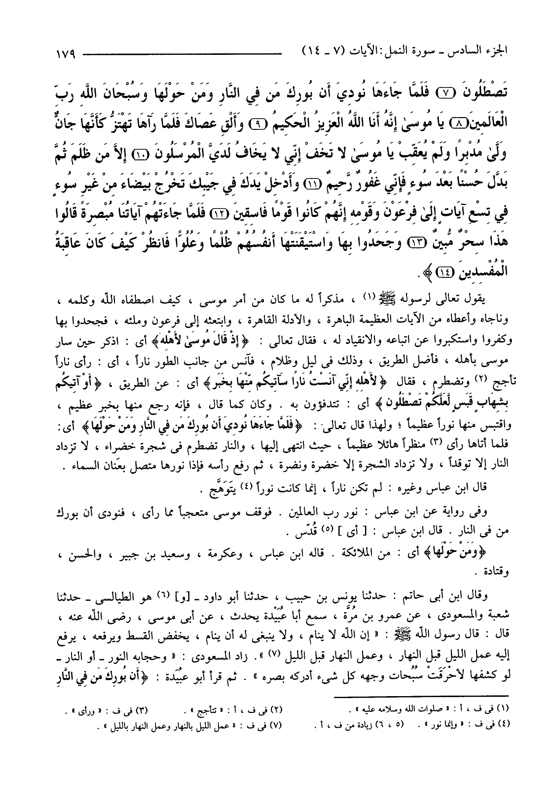 وَفِي رِوَايَةٍ عَنِ ابْنِ عَبَّاسٍ: نُورُ رَبِّ الْعَالَمِينَ. فَوَقَفَ مُوسَى مُتَعَجِّبًا مِمَّا رَأَى، فَنُودِيَ أَنْ بُورِكَ مَنْ فِي النَّارِ. قَالَ ابْنُ عَبَّاسٍ: [أَيْ] (5) قُدّس.