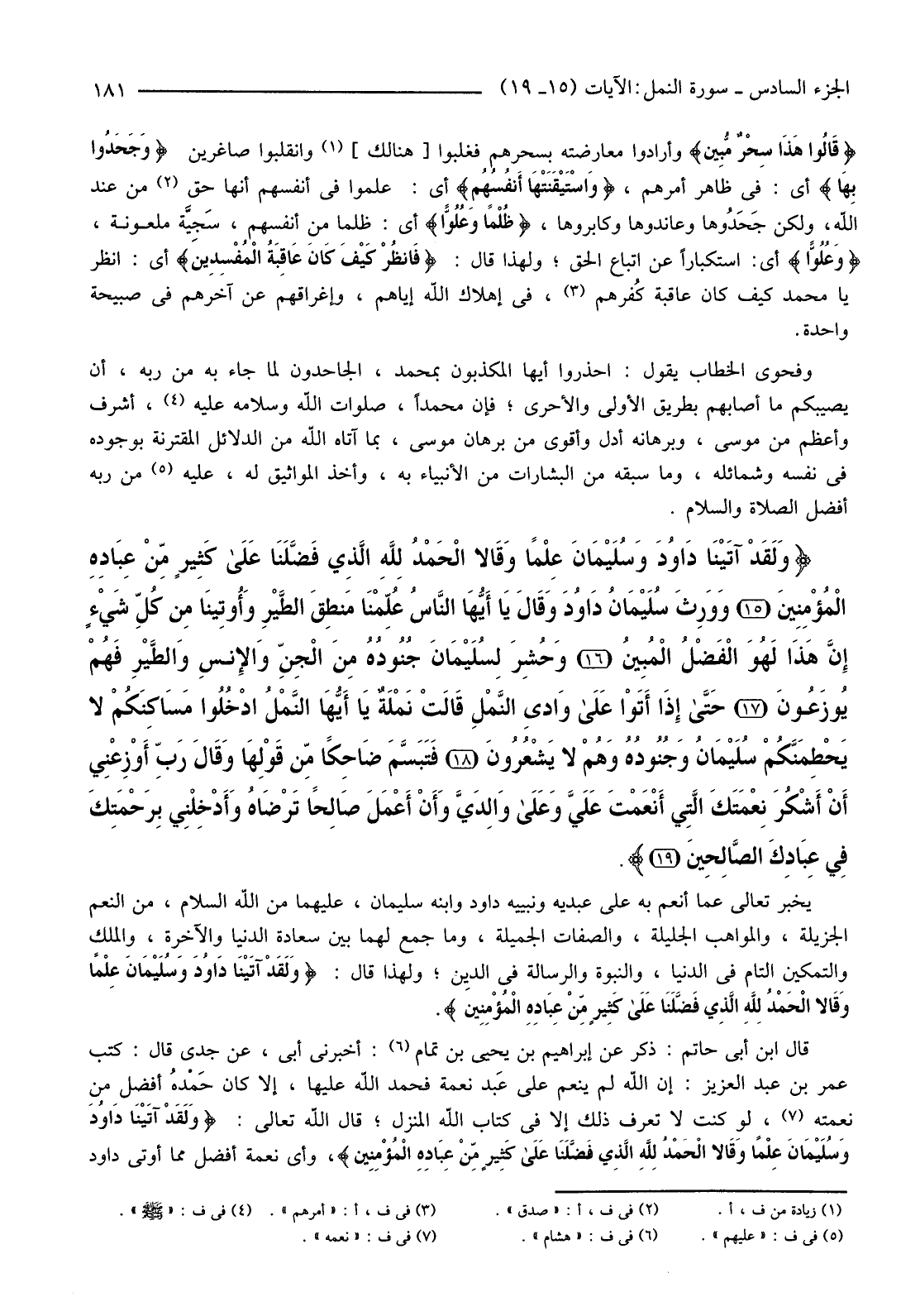 {وَلَقَدْ آتَيْنَا دَاوُدَ وَسُلَيْمَانَ عِلْمًا وَقَالا الْحَمْدُ لِلَّهِ الَّذِي فَضَّلَنَا عَلَى كَثِيرٍ مِنْ عِبَادِهِ الْمُؤْمِنِينَ (15) وَوَرِثَ سُلَيْمَانُ دَاوُدَ وَقَالَ يَا أَيُّهَا النَّاسُ عُلِّمْنَا مَنْطِقَ الطَّيْرِ وَأُوتِينَا مِنْ كُلِّ شَيْءٍ إِنَّ هَذَا لَهُوَ الْفَضْلُ الْمُبِينُ (16) وَحُشِرَ لِسُلَيْمَانَ جُنُودُهُ مِنَ الْجِنِّ وَالإنْسِ وَالطَّيْرِ فَهُمْ يُوزَعُونَ (17) حَتَّى إِذَا أَتَوْا عَلَى وَادِي النَّمْلِ قَالَتْ نَمْلَةٌ يَا أَيُّهَا النَّمْلُ ادْخُلُوا مَسَاكِنَكُمْ لَا يَحْطِمَنَّكُمْ سُلَيْمَانُ وَجُنُودُهُ وَهُمْ لَا يَشْعُرُونَ (18) فَتَبَسَّمَ ضَاحِكًا مِنْ قَوْلِهَا وَقَالَ رَبِّ أَوْزِعْنِي أَنْ أَشْكُرَ نِعْمَتَكَ الَّتِي أَنْعَمْتَ عَلَيَّ وَعَلَى وَالِدَيَّ وَأَنْ أَعْمَلَ صَالِحًا تَرْضَاهُ وَأَدْخِلْنِي بِرَحْمَتِكَ فِي عِبَادِكَ الصَّالِحِينَ (19) } .