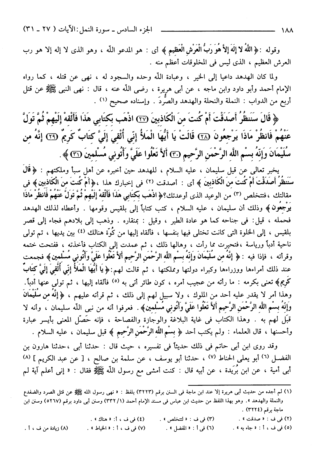 {إِنَّهُ مِنْ سُلَيْمَانَ وَإِنَّهُ بِسْمِ اللَّهِ الرَّحْمَنِ الرَّحِيمِ أَلا تَعْلُوا عَلَيَّ وَأْتُونِي مُسْلِمِينَ} .فَعَرَفُوا أَنَّهُ مِنْ نَبِيِّ اللَّهِ سُلَيْمَانَ، وَأَنَّهُ لَا قبَل لَهُمْ بِهِ. وَهَذَا الْكِتَابُ فِي غَايَةِ الْبَلَاغَةِ وَالْوَجَازَةِ وَالْفَصَاحَةِ، فَإِنَّهُ حَصّل الْمَعْنَى بِأَيْسَرِ عِبَارَةٍ وَأَحْسَنِهَا، قَالَ الْعُلَمَاءُ: وَلَمْ يَكْتُبْ أَحَدٌ {بِسْمِ اللَّهِ الرَّحْمَنِ الرَّحِيمِ} قَبْلَ سُلَيْمَانَ، عَلَيْهِ السَّلَامُ.