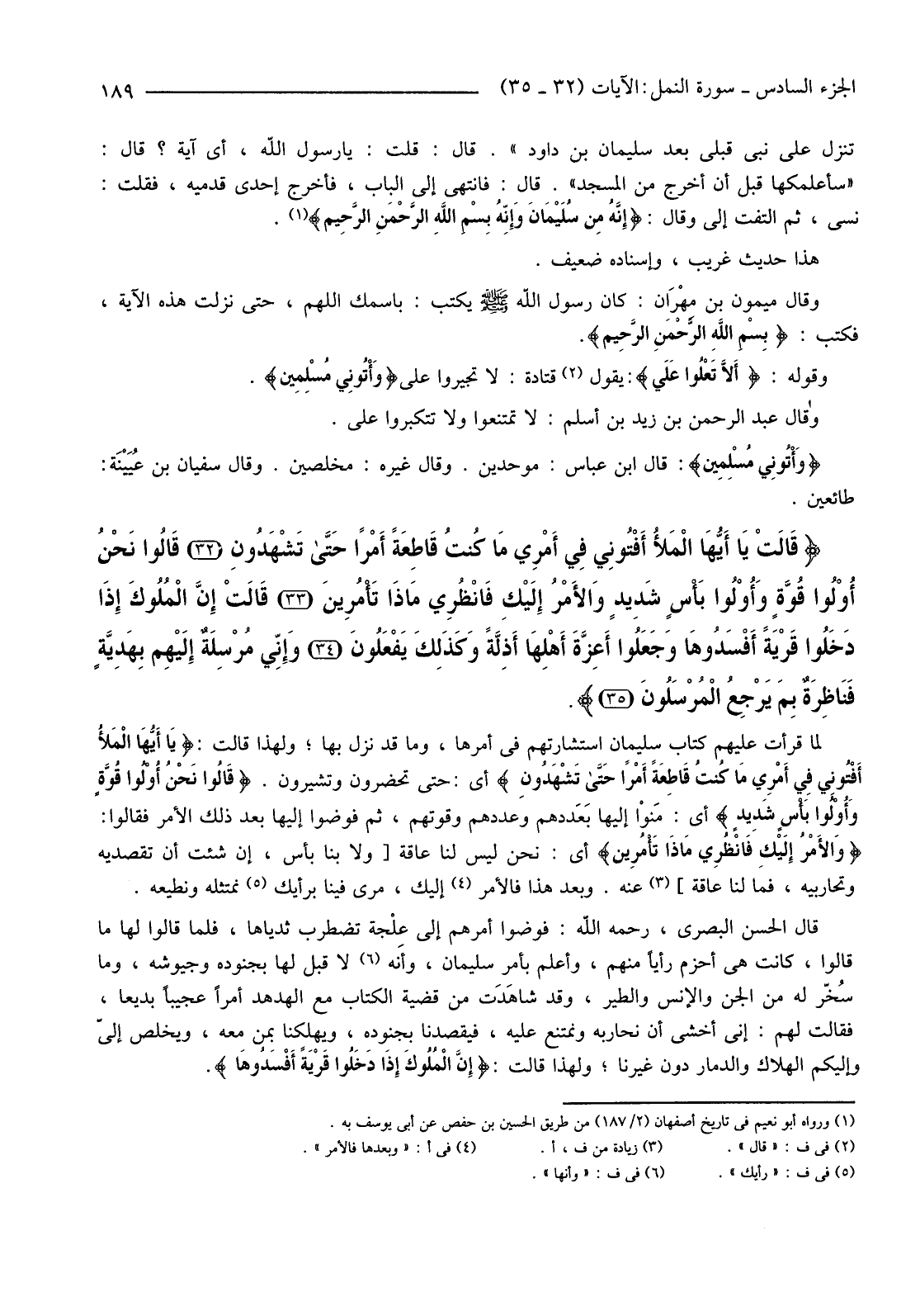{قَالَتْ يَا أَيُّهَا الْمَلأ أَفْتُونِي فِي أَمْرِي مَا كُنْتُ قَاطِعَةً أَمْرًا حَتَّى تَشْهَدُونِ (32) قَالُوا نَحْنُ أُولُو قُوَّةٍ وَأُولُو بَأْسٍ شَدِيدٍ وَالأمْرُ إِلَيْكِ فَانْظُرِي مَاذَا تَأْمُرِينَ (33) قَالَتْ إِنَّ الْمُلُوكَ إِذَا دَخَلُوا قَرْيَةً أَفْسَدُوهَا وَجَعَلُوا أَعِزَّةَ أَهْلِهَا أَذِلَّةً وَكَذَلِكَ يَفْعَلُونَ (34) وَإِنِّي مُرْسِلَةٌ إِلَيْهِمْ بِهَدِيَّةٍ فَنَاظِرَةٌ بِمَ يَرْجِعُ الْمُرْسَلُونَ (35) } .