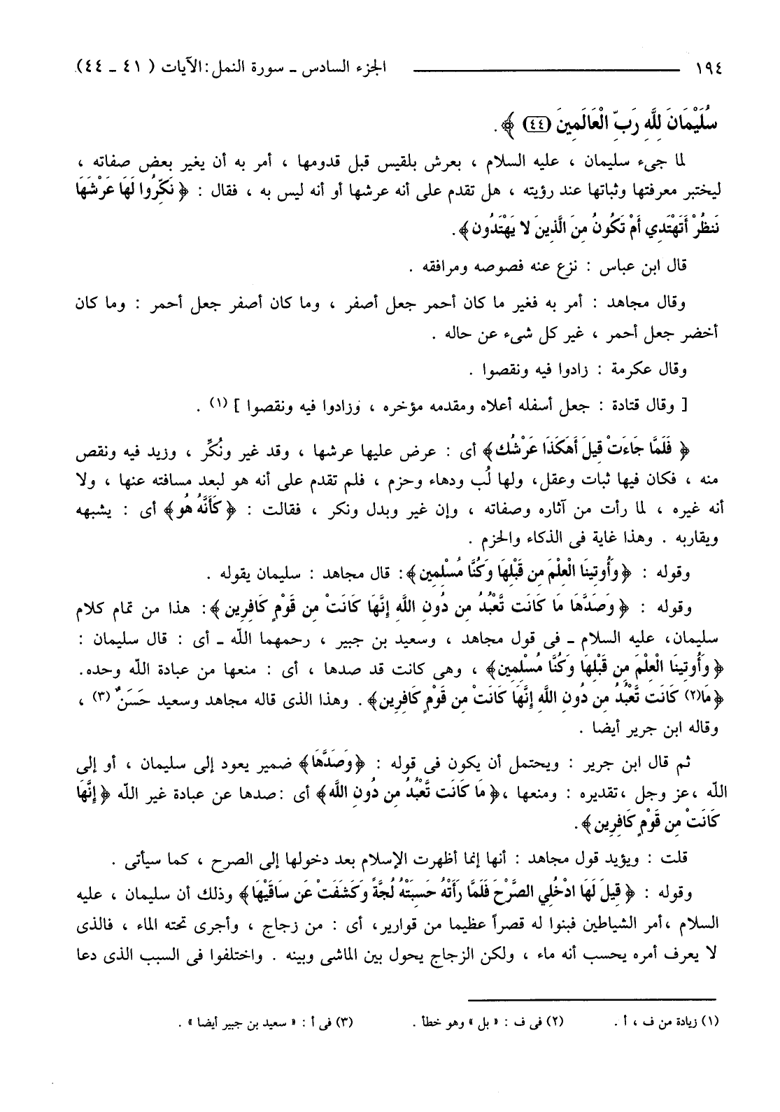 {قَالَ نَكِّرُوا لَهَا عَرْشَهَا نَنْظُرْ أَتَهْتَدِي أَمْ تَكُونُ مِنَ الَّذِينَ لَا يَهْتَدُونَ (41) فَلَمَّا جَاءَتْ قِيلَ أَهَكَذَا عَرْشُكِ قَالَتْ كَأَنَّهُ هُوَ وَأُوتِينَا الْعِلْمَ مِنْ قَبْلِهَا وَكُنَّا مُسْلِمِينَ (42) وَصَدَّهَا مَا كَانَتْ تَعْبُدُ مِنْ دُونِ اللَّهِ إِنَّهَا كَانَتْ مِنْ قَوْمٍ كَافِرِينَ (43) قِيلَ لَهَا ادْخُلِي الصَّرْحَ فَلَمَّا رَأَتْهُ حَسِبَتْهُ لُجَّةً وَكَشَفَتْ عَنْ سَاقَيْهَا قَالَ إِنَّهُ صَرْحٌ مُمَرَّدٌ مِنْ قَوَارِيرَ قَالَتْ رَبِّ إِنِّي ظَلَمْتُ نَفْسِي وَأَسْلَمْتُ مَعَ سُلَيْمَانَ لِلَّهِ رَبِّ الْعَالَمِينَ (44) }