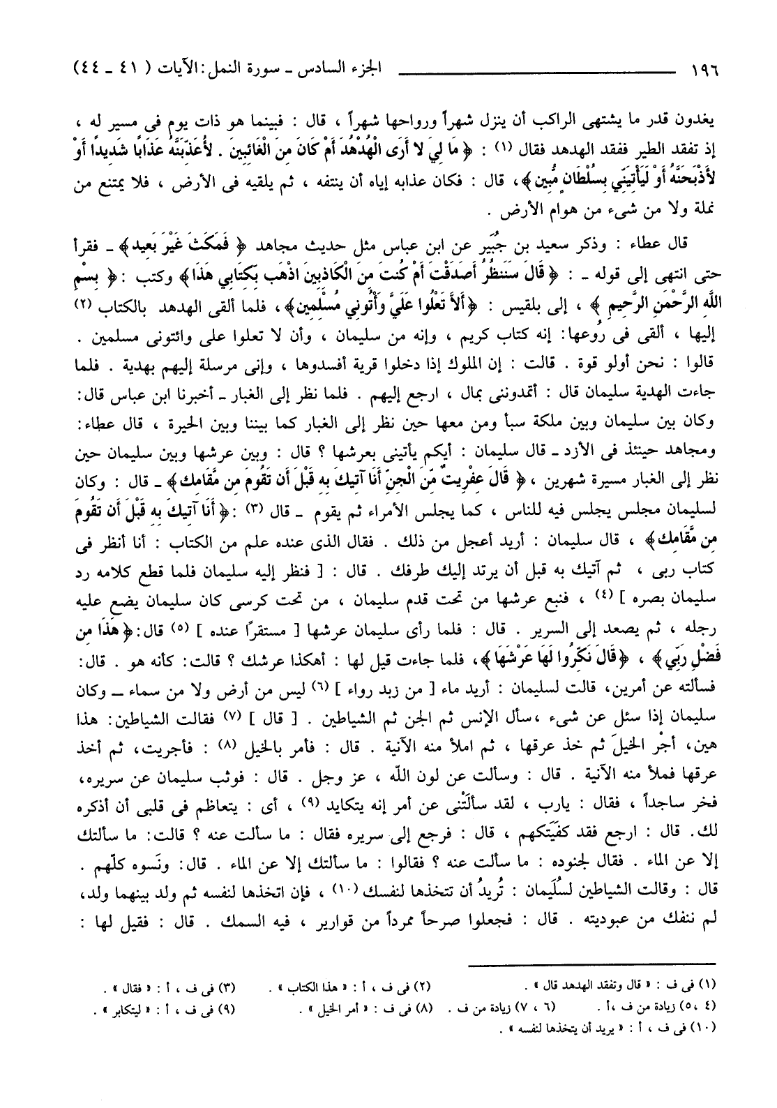 قَالَ عَطَاءٌ: وَذَكَرَ سَعِيدِ بْنِ جُبَير عَنِ ابْنِ عَبَّاسٍ مِثْلُ حَدِيثِ مُجَاهِدٍ {فَمَكَثَ غَيْرَ بَعِيدٍ} -فَقَرَأَ حَتَّى انْتَهَى إِلَى قَوْلِهِ - {قَالَ سَنَنْظُرُ أَصَدَقْتَ أَمْ كُنْتَ مِنَ الْكَاذِبِينَ اذْهَبْ بِكِتَابِي هَذَا} وَكَتَبَ {بِسْمِ اللَّهِ الرَّحْمَنِ الرَّحِيمِ} ، إِلَى بِلْقِيسَ: {أَلا تَعْلُوا عَلَيَّ وَأْتُونِي مُسْلِمِينَ} ، فَلَمَّا أَلْقَى الْهُدْهُدُ بِالْكِتَابِ (2) إِلَيْهَا، أُلْقِيَ فِي رُوعها: إِنَّهُ كِتَابٌ كَرِيمٌ، وَإِنَّهُ مِنْ سُلَيْمَانَ، وَأَنْ لَا تَعْلُوا عَلَيَّ وَأَتَوْنِي مُسْلِمِينَ. قَالُوا: نَحْنُ أُولُو قُوَّةٍ. قَالَتْ: إِنَّ الْمُلُوكَ إِذَا دَخَلُوا قَرْيَةً أَفْسَدُوهَا، وَإِنِّي مُرْسِلَةٌ إِلَيْهِمْ بِهَدِيَّةٍ. فَلَمَّا جَاءَتِ الْهَدِيَّةُ سُلَيْمَانَ قَالَ: أَتُمِدُّونَنِي بِمَالٍ، ارْجِعْ إِلَيْهِمْ. فَلَمَّا نَظَرَ إِلَى الْغُبَارِ -أَخْبَرَنَا ابْنُ عَبَّاسٍ قَالَ: وَكَانَ بَيْنَ سُلَيْمَانَ وَبَيْنَ مَلِكَةِ سَبَأٍ ومَنْ مَعَهَا حِينَ نَظَرَ إِلَى الْغُبَارِ كَمَا بَيْنَنَا وَبَيْنَ الْحِيرَةِ، قَالَ عَطَاءٌ: وَمُجَاهِدٌ حِينَئِذٍ فِي الْأَزْدِ -قَالَ سُلَيْمَانُ: أَيُّكُمْ يَأْتِينِي بِعَرْشِهَا؟ قَالَ: وَبَيْنَ عَرْشِهَا وَبَيْنَ سُلَيْمَانَ حِينَ نَظَرَ إِلَى الْغُبَارِ مَسِيرَةُ شَهْرَيْنِ، {قَالَ عِفْريتٌ مِنَ الْجِنِّ أَنَا آتِيكَ بِهِ قَبْلَ أَنْ تَقُومَ مِنْ مَقَامِكَ} . قَالَ: وَكَانَ لِسُلَيْمَانَ مَجْلِسٌ يَجْلِسُ فِيهِ لِلنَّاسِ، كَمَا يَجْلِسُ الْأُمَرَاءُ ثُمَّ يَقُومُ -قَالَ: (3) {أَنَا آتِيكَ بِهِ قَبْلَ أَنْ تَقُومَ مِنْ مَقَامِكَ} . قَالَ سُلَيْمَانُ: أُرِيدُ أَعْجَلَ مِنْ ذَلِكَ. فَقَالَ الَّذِي عِنْدَهُ عِلْمٌ مِنَ الْكِتَابِ: أَنَا أَنْظُرُ فِي كِتَابِ رَبِّي، ثُمَّ آتِيكَ بِهِ قَبْلَ أَنْ يَرْتَدَّ إِلَيْكَ طَرْفُكَ. قَالَ: [فَنَظَرَ إِلَيْهِ سُلَيْمَانُ فَلَمَّا قَطَعَ كَلَامَهُ رَدَّ سُلَيْمَانُ بَصَرَهُ] (4) ، فَنَبَعَ عَرْشُهَا مِنْ تَحْتِ قَدَمِ سُلَيْمَانَ، مِنْ تَحْتِ كُرْسِيٍّ كَانَ سُلَيْمَانُ يَضَعُ عَلَيْهِ رِجْلَهُ، ثُمَّ يَصْعَدُ إِلَى السَّرِيرِ. قَالَ: فَلَمَّا رَأَى سُلَيْمَانُ عَرْشَهَا [مُسْتَقِرًّا عِنْدَهُ] (5) قَالَ: {هَذَا مِنْ فَضْلِ رَبِّي} ، {قَالَ نَكِّرُوا لَهَا عَرْشَهَا} ، فَلَمَّا جَاءَتْ قِيلَ لَهَا: أَهَكَذَا عَرْشُكِ؟ قَالَتْ: كَأَنَّهُ هُوَ. قَالَ: فَسَأَلَتْهُ عَنْ أَمْرَيْنِ، قَالَتْ لِسُلَيْمَانَ: أُرِيدُ مَاءً [مِنْ زَبَدٍ رِوَاءً] (6) لَيْسَ مِنْ أَرْضٍ وَلَا مِنْ سَمَاءٍ -وَكَانَ سُلَيْمَانُ إِذَا سُئِلَ عَنْ شَيْءٍ، سَأَلَ الْإِنْسَ ثُمَّ الْجِنَّ ثُمَّ الشَّيَاطِينَ. [قَالَ] (7) فَقَالَتِ الشَّيَاطِينُ: هَذَا هَيِّنٌ، أجْرِ الخيلَ ثُمَّ خُذْ عَرَقَهَا، ثُمَّ امْلَأْ مِنْهُ الْآنِيَةَ. قَالَ: فَأَمَرَ بِالْخَيْلِ (8) فَأُجْرِيَتْ، ثُمَّ أَخَذَ عَرَقَهَا فَمَلَأَ مِنْهُ الْآنِيَةَ. قَالَ: وَسَأَلَتْ عَنْ لَوْنِ اللَّهِ عَزَّ وَجَلَّ. قَالَ: فَوَثَبَ سُلَيْمَانُ عَنْ سَرِيرِهِ، فَخَرَّ سَاجِدًا، فَقَالَ: يَا رَبِّ، لَقَدْ سألَتْني عَنْ أَمْرٍ إِنَّهُ يَتَكَايَدُ (9) ، أَيْ: يَتَعَاظَمُ فِي قَلْبِي أَنْ أَذْكُرَهُ لَكَ. قَالَ: ارْجِعْ فَقَدْ كَفَيتكهم، قَالَ: فَرَجَعَ إِلَى سَرِيرِهِ فَقَالَ: مَا سَأَلْتِ عَنْهُ؟ قَالَتْ: مَا سَأَلْتُكَ إِلَّا عَنِ الْمَاءِ. فَقَالَ لِجُنُودِهِ: مَا سَأَلَتْ عَنْهُ؟ فَقَالُوا: مَا سَأَلَتْكَ إِلَّا عَنِ الْمَاءِ. قَالَ: ونَسوه كُلُّهُمْ. قَالَ: وَقَالَتِ الشَّيَاطِينُ لسُلَيمان: تُريدُ أَنْ تَتَّخِذَهَا لِنَفْسِكَ (10) ، فَإِنِ اتَّخَذَهَا لِنَفْسِهِ ثُمَّ وُلِدَ بَيْنَهُمَا وَلَدٌ، لَمْ نَنْفَكَّ مِنْ عُبُودِيَّتِهِ. قَالَ: فَجَعَلُ
