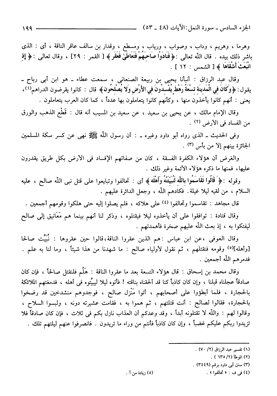 وَقَالَ الْعَوْفِيُّ، عَنِ ابْنِ عَبَّاسٍ: هُمُ الَّذِينَ عَقَرُوا النَّاقَةَ، قَالُوا حِينَ عَقَرُوهَا: نُبَيِّت صَالِحًا [وَأَهْلَهُ] (5) وَقَوْمَهُ فَنَقْتُلُهُمْ، ثُمَّ نَقُولُ لِأَوْلِيَاءِ صَالِحٍ: مَا شَهِدْنَا مِنْ هَذَا شَيْئًا، وَمَا لَنَا بِهِ مِنْ عِلْمٍ. فَدَمَّرَهُمُ اللَّهُ أَجْمَعِينَ.