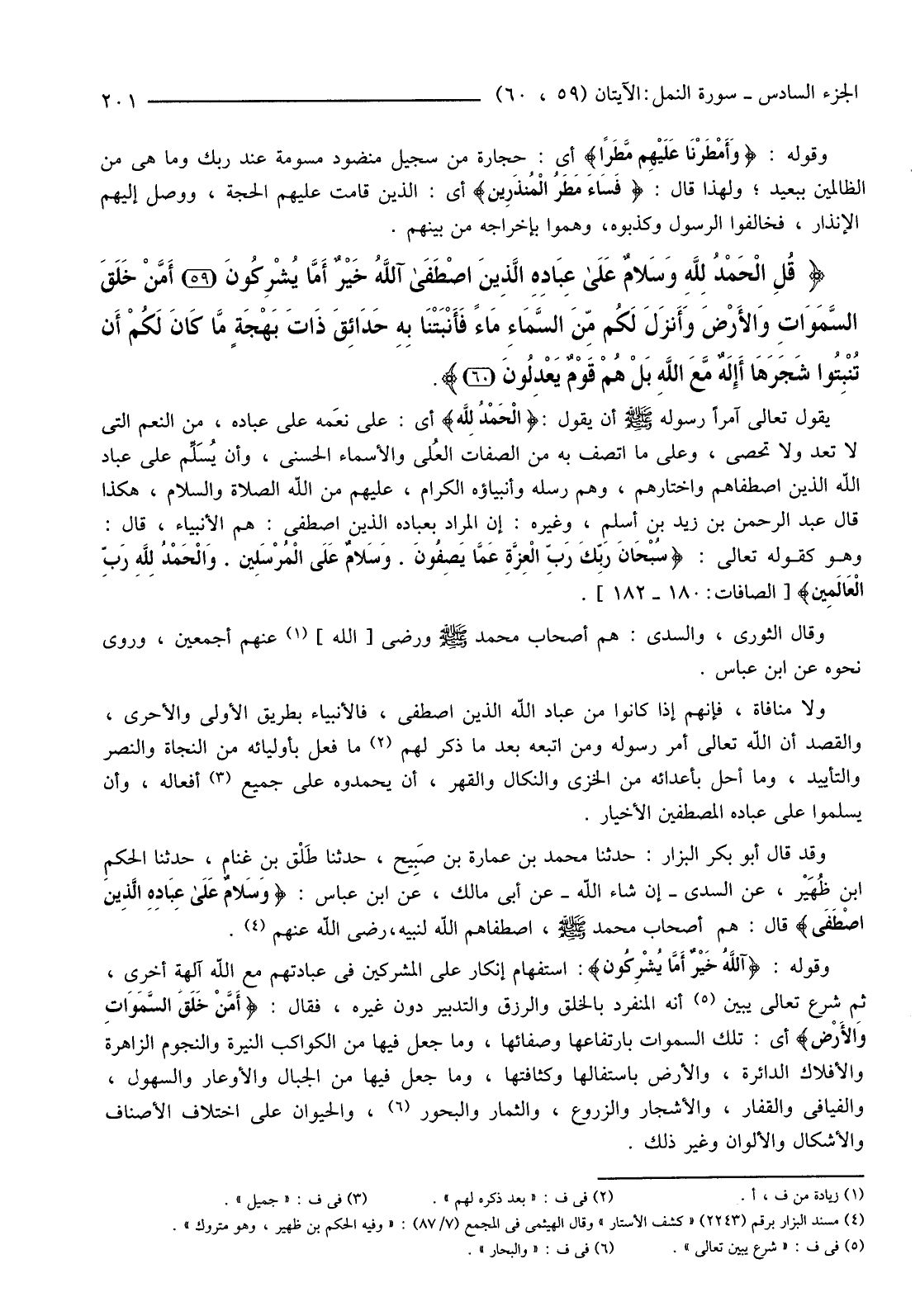 {قُلِ الْحَمْدُ لِلَّهِ وَسَلامٌ عَلَى عِبَادِهِ الَّذِينَ اصْطَفَى آللَّهُ خَيْرٌ أَمْ مَا يُشْرِكُونَ (59) أَمْ مَنْ خَلَقَ السَّمَوَاتِ وَالأرْضَ وَأَنزلَ لَكُمْ مِنَ السَّمَاءِ مَاءً فَأَنْبَتْنَا بِهِ حَدَائِقَ ذَاتَ بَهْجَةٍ مَا كَانَ لَكُمْ أَنْ تُنْبِتُوا شَجَرَهَا أَإِلَهٌ مَعَ اللَّهِ بَلْ هُمْ قَوْمٌ يَعْدِلُونَ (60) } .