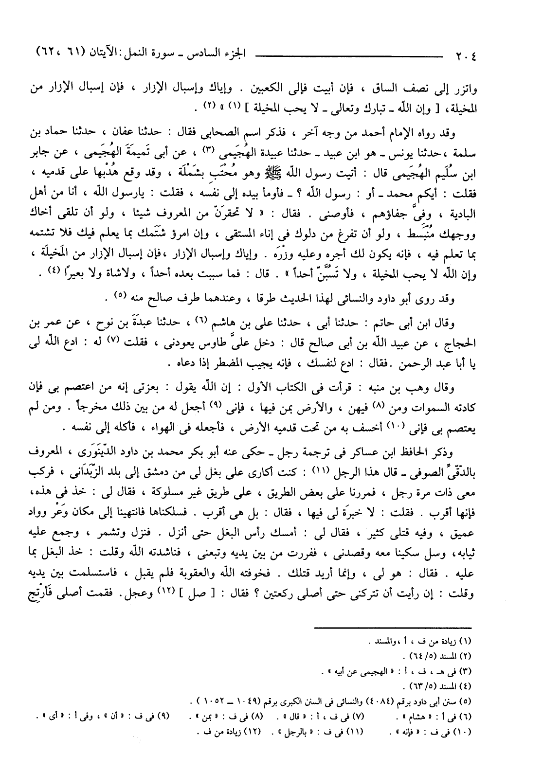 وَقَدْ رَوَاهُ الْإِمَامُ أَحْمَدُ مِنْ وَجْهٍ آخَرَ، فَذَكَرَ اسْمَ الصَّحَابِيِّ فَقَالَ: حَدَّثَنَا عَفَّانُ، حَدَّثَنَا حَمَّادُ بْنُ سَلَمَةَ، حَدَّثَنَا يُونُسُ -هُوَ ابْنُ عُبَيْدٍ -حَدَّثَنَا عُبَيْدَةُ الهُجَيْمي (3) عَنْ أَبِي تَميمَةَ الهُجَيْمي، عَنْ جَابِرِ بْنِ سُلَيم الهُجَيمي قَالَ: أَتَيْتُ رَسُولَ اللَّهِ صَلَّى اللَّهُ عَلَيْهِ وَسَلَّمَ وَهُوَ مُحْتَبٍ بِشَمْلَة، وَقَدْ وَقَعَ هُدْبها عَلَى قَدَمَيْهِ، فَقُلْتُ: أَيُّكُمْ مُحَمَّدٌ -أَوْ: رَسُولُ اللَّهِ؟ -فَأَوْمَأَ بِيَدِهِ إِلَى نَفْسِهِ، فَقُلْتُ: يَا رَسُولَ اللَّهِ، أَنَا مِنْ أَهْلِ الْبَادِيَةِ، وفِيَّ جَفَاؤُهُمْ، فَأَوْصِنِي. فَقَالَ: "لَا تحقرَنّ مِنَ الْمَعْرُوفِ شَيْئًا، وَلَوْ أَنْ تَلْقَى أَخَاكَ وَوَجْهُكَ مُنْبَسط، وَلَوْ أَنْ تُفْرِغَ مِنْ دَلْوِكَ فِي إِنَاءِ الْمُسْتَقِي، وَإِنِ امْرُؤٌ شَتَمك بِمَا يَعْلَمُ فِيكَ فَلَا تَشْتِمْهُ بِمَا تَعْلَمُ فِيهِ، فَإِنَّهُ يَكُونُ لَكَ أَجْرُهُ وَعَلَيْهِ وزْرُه. وَإِيَّاكَ وَإِسْبَالَ الْإِزَارِ، فَإِنَّ إِسْبَالَ الْإِزَارِ مِنَ المَخيلَة، وَإِنَّ اللَّهَ لَا يُحِبُّ الْمَخِيلَةَ، وَلَا تَسُبَّنّ أَحَدًا". قَالَ: فَمَا سَبَبْتُ بَعْدَهُ أَحَدًا، وَلَا شَاةً وَلَا بَعِيرًا (4) .