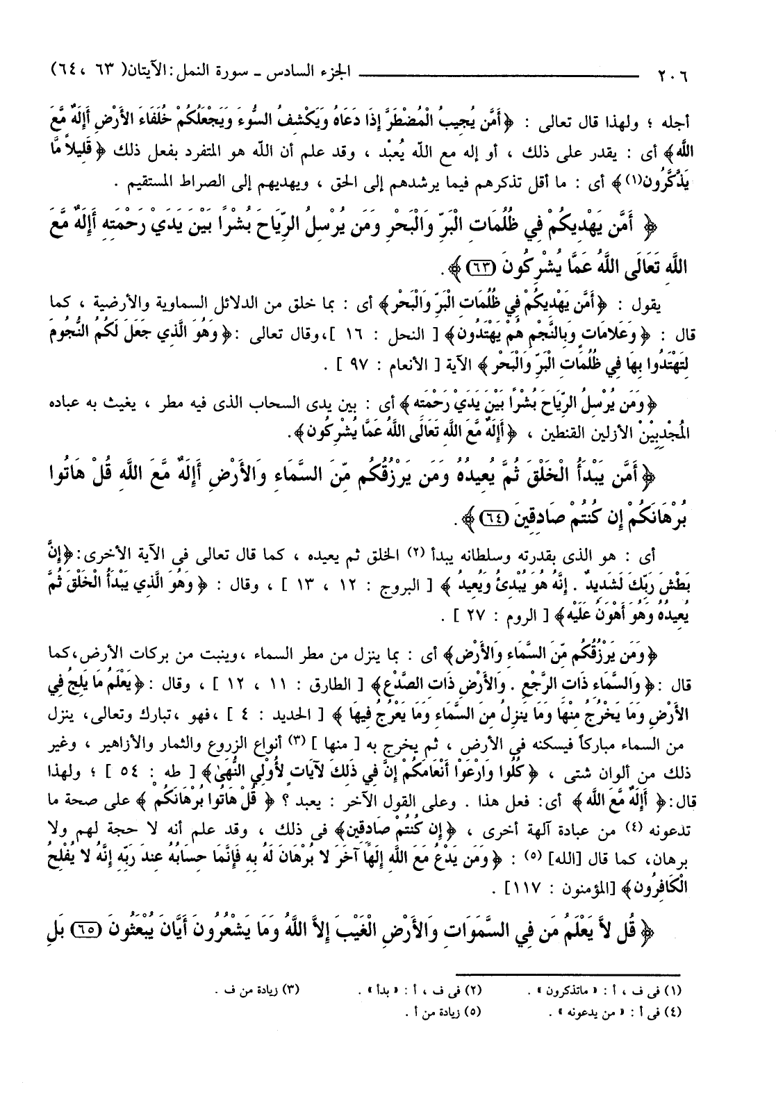 {أَمَّنْ مَنْ يَبْدَأُ الْخَلْقَ ثُمَّ يُعِيدُهُ وَمَنْ يَرْزُقُكُمْ مِنَ السَّمَاءِ وَالأرْضِ أَإِلَهٌ مَعَ اللَّهِ قُلْ هَاتُوا بُرْهَانَكُمْ إِنْ كُنْتُمْ صَادِقِينَ (64) } .