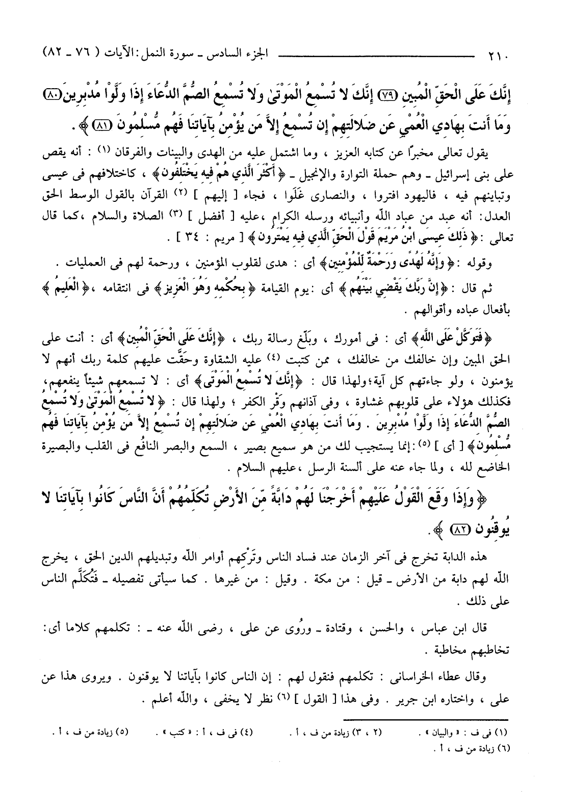 {وَإِنَّهُ لَهُدًى وَرَحْمَةٌ لِلْمُؤْمِنِينَ (77) إِنَّ رَبَّكَ يَقْضِي بَيْنَهُمْ بِحُكْمِهِ وَهُوَ الْعَزِيزُ الْعَلِيمُ (78) فَتَوَكَّلْ عَلَى اللَّهِ إِنَّكَ عَلَى الْحَقِّ الْمُبِينِ (79) إِنَّكَ لَا تُسْمِعُ الْمَوْتَى وَلا تُسْمِعُ الصُّمَّ الدُّعَاءَ إِذَا وَلَّوْا مُدْبِرِينَ (80) وَمَا أَنْتَ بِهَادِي الْعُمْيِ عَنْ ضَلالَتِهِمْ إِنْ تُسْمِعُ إِلا مَنْ يُؤْمِنُ بِآيَاتِنَا فَهُمْ مُسْلِمُونَ (81) } .