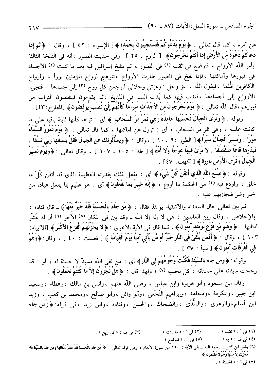 ثُمَّ بَيَّنَ تَعَالَى حَالَ السُّعَدَاءِ وَالْأَشْقِيَاءِ يَوْمَئِذٍ فَقَالَ: {مَنْ جَاءَ بِالْحَسَنَةِ فَلَهُ خَيْرٌ مِنْهَا} -قَالَ قَتَادَةُ: بِالْإِخْلَاصِ. وَقَالَ زَيْنُ الْعَابِدِينَ: هِيَ لَا إِلَهَ إِلَّا اللَّهُ -وَقَدْ بيَّن فِي الْمَكَانِ (5) الْآخَرِ (6) أَنَّ لَهُ عَشْر أَمْثَالِهَا {وَهُمْ مِنْ فَزَعٍ يَوْمَئِذٍ آمِنُونَ} ، كَمَا قَالَ فِي الْآيَةِ الْأُخْرَى: {لَا يَحْزُنُهُمُ الْفَزَعُ الأكْبَرُ} [الْأَنْبِيَاءِ: 103] ، وَقَالَ: {أَفَمَنْ يُلْقَى فِي النَّارِ خَيْرٌ أَمْ مَنْ يَأْتِي آمِنًا يَوْمَ الْقِيَامَةِ} [فُصِّلَتْ: 40] ، وَقَالَ: {وَهُمْ فِي الْغُرُفَاتِ آمِنُونَ} [سَبَأٍ: 37] .