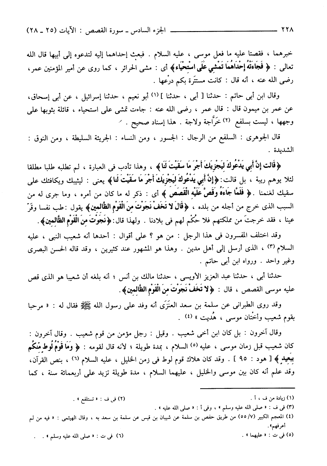 وَقَالَ آخَرُونَ: بَلْ كَانَ ابْنَ أَخِي شُعَيْبٍ. وَقِيلَ: رَجُلٌ مُؤْمِنٌ مِنْ قَوْمِ شُعَيْبٍ. وَقَالَ آخَرُونَ: كَانَ شُعَيْبٌ قَبْلَ زَمَانِ مُوسَى، عَلَيْهِ (5) السَّلَامُ، بِمُدَّةٍ طَوِيلَةٍ؛ لِأَنَّهُ قَالَ لِقَوْمِهِ: {وَمَا قَوْمُ لُوطٍ مِنْكُمْ بِبَعِيدٍ} [هُودٍ: 95] . وَقَدْ كَانَ هَلَاكُ قَوْمِ لُوطٍ فِي زَمَنِ الْخَلِيلِ، عَلَيْهِ السَّلَامُ (6) بِنَصِّ الْقُرْآنِ، وَقَدْ عُلِمَ أَنَّهُ كَانَ بَيْنَ مُوسَى وَالْخَلِيلِ، عَلَيْهِمَا السَّلَامُ، مُدَّةٌ طويلة تزيد على أربعمائة سنة، كما