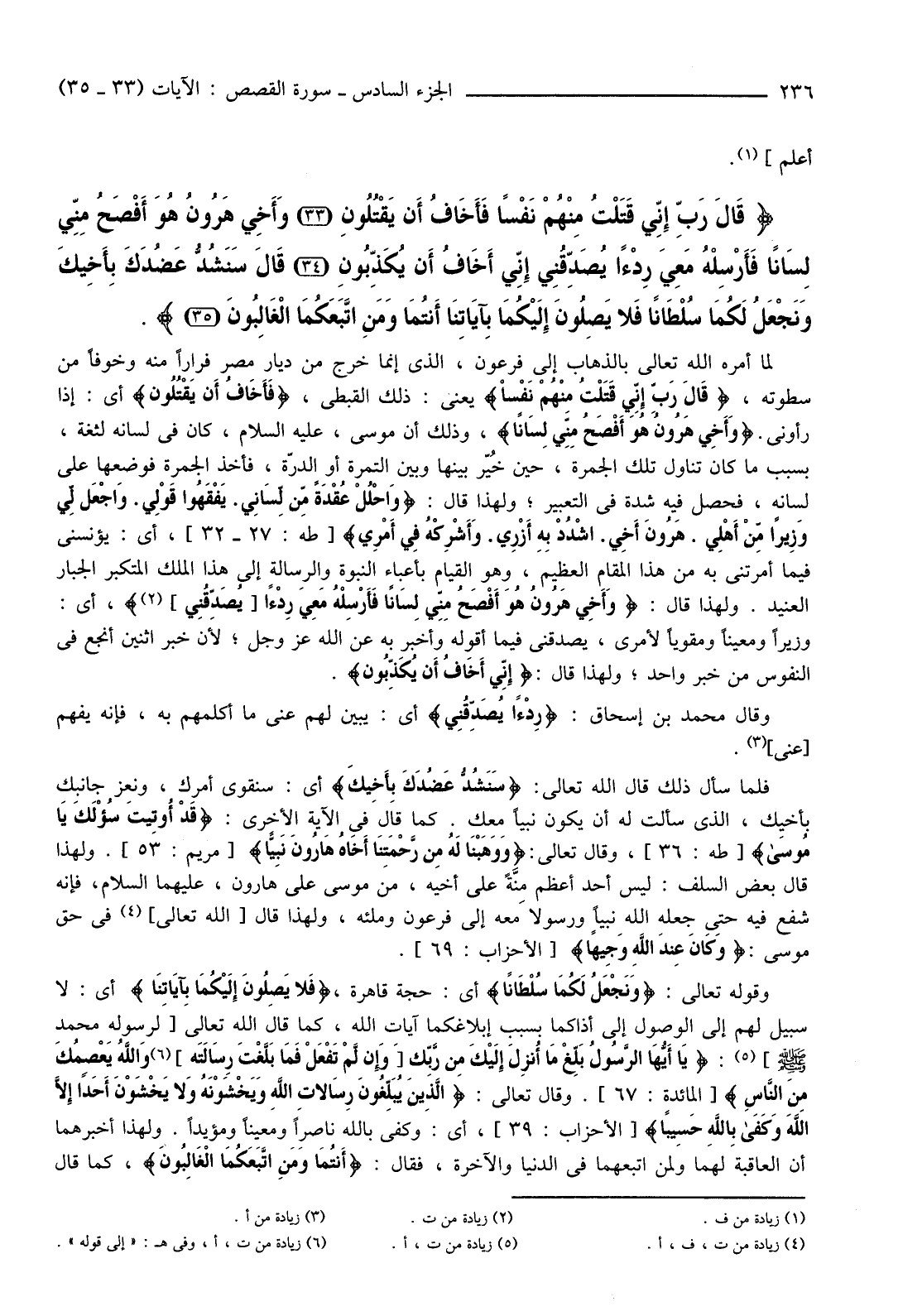 {قَالَ رَبِّ إِنِّي قَتَلْتُ مِنْهُمْ نَفْسًا فَأَخَافُ أَنْ يَقْتُلُونِ (33) وَأَخِي هَارُونُ هُوَ أَفْصَحُ مِنِّي لِسَانًا فَأَرْسِلْهُ مَعِيَ رِدْءًا يُصَدِّقُنِي إِنِّي أَخَافُ أَنْ يُكَذِّبُونِ (34) قَالَ سَنَشُدُّ عَضُدَكَ بِأَخِيكَ وَنَجْعَلُ لَكُمَا سُلْطَانًا فَلا يَصِلُونَ إِلَيْكُمَا بِآيَاتِنَا أَنْتُمَا وَمَنِ اتَّبَعَكُمَا الْغَالِبُونَ (35) } .