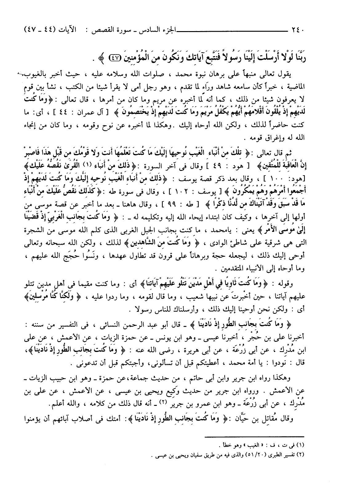 ثُمَّ قَالَ تَعَالَى: {تِلْكَ مِنْ أَنْبَاءِ الْغَيْبِ نُوحِيهَا إِلَيْكَ مَا كُنْتَ تَعْلَمُهَا أَنْتَ وَلا قَوْمُكَ مِنْ قَبْلِ هَذَا فَاصْبِرْ إِنَّ الْعَاقِبَةَ لِلْمُتَّقِينَ} [هُودٍ: 49] وَقَالَ فِي آخِرِ السُّورَةِ {ذَلِكَ مِنْ أَنْبَاءِ (1) الْقُرَى نَقُصُّهُ عَلَيْكَ} [هُودٍ: 100] ، وَقَالَ بَعْدَ ذِكْرِ قِصَّةِ يُوسُفَ: {ذَلِكَ مِنْ أَنْبَاءِ الْغَيْبِ نُوحِيهِ إِلَيْكَ وَمَا كُنْتَ لَدَيْهِمْ إِذْ أَجْمَعُوا أَمْرَهُمْ وَهُمْ يَمْكُرُونَ} [يُوسُفَ: 102] ، وَقَالَ فِي سُورَةِ طَهَ: {كَذَلِكَ نَقُصُّ عَلَيْكَ مِنْ أَنْبَاءِ مَا قَدْ سَبَقَ وَقَدْ آتَيْنَاكَ مِنْ لَدُنَّا ذِكْرًا} [طَهَ: 99] وقال ها هنا -بَعْدَمَا أَخْبَرَ عَنْ قِصَّةِ مُوسَى مِنْ أَوَّلِهَا إِلَى آخِرِهَا، وَكَيْفَ كَانَ ابْتِدَاءُ إِيحَاءِ اللَّهِ إِلَيْهِ وَتَكْلِيمُهُ لَهُ -: {وَمَا كُنْتَ بِجَانِبِ الْغَرْبِيِّ إِذْ قَضَيْنَا إِلَى مُوسَى الأمْرَ} يَعْنِي: يَا مُحَمَّدُ، مَا كُنْتَ بِجَانِبِ الْجَبَلِ الْغَرْبِيِّ الَّذِي كَلَّمَ اللَّهُ مُوسَى مِنَ الشَّجَرَةِ الَّتِي هِيَ شَرْقِيَّةٌ عَلَى شَاطِئِ الْوَادِي، {وَمَا كُنْتَ مِنَ الشَّاهِدِينَ} لِذَلِكَ، وَلَكِنَّ اللَّهَ سُبْحَانَهُ وَتَعَالَى أَوْحَى إِلَيْكَ ذَلِكَ، لِيَجْعَلَهُ حُجَّةً وَبُرْهَانًا عَلَى قُرُونٍ قَدْ تَطَاوَلَ عَهْدُهَا، ونَسُوا حُجَج اللَّهِ عَلَيْهِمْ، وَمَا أَوْحَاهُ إِلَى الْأَنْبِيَاءِ الْمُتَقَدِّمِينَ.