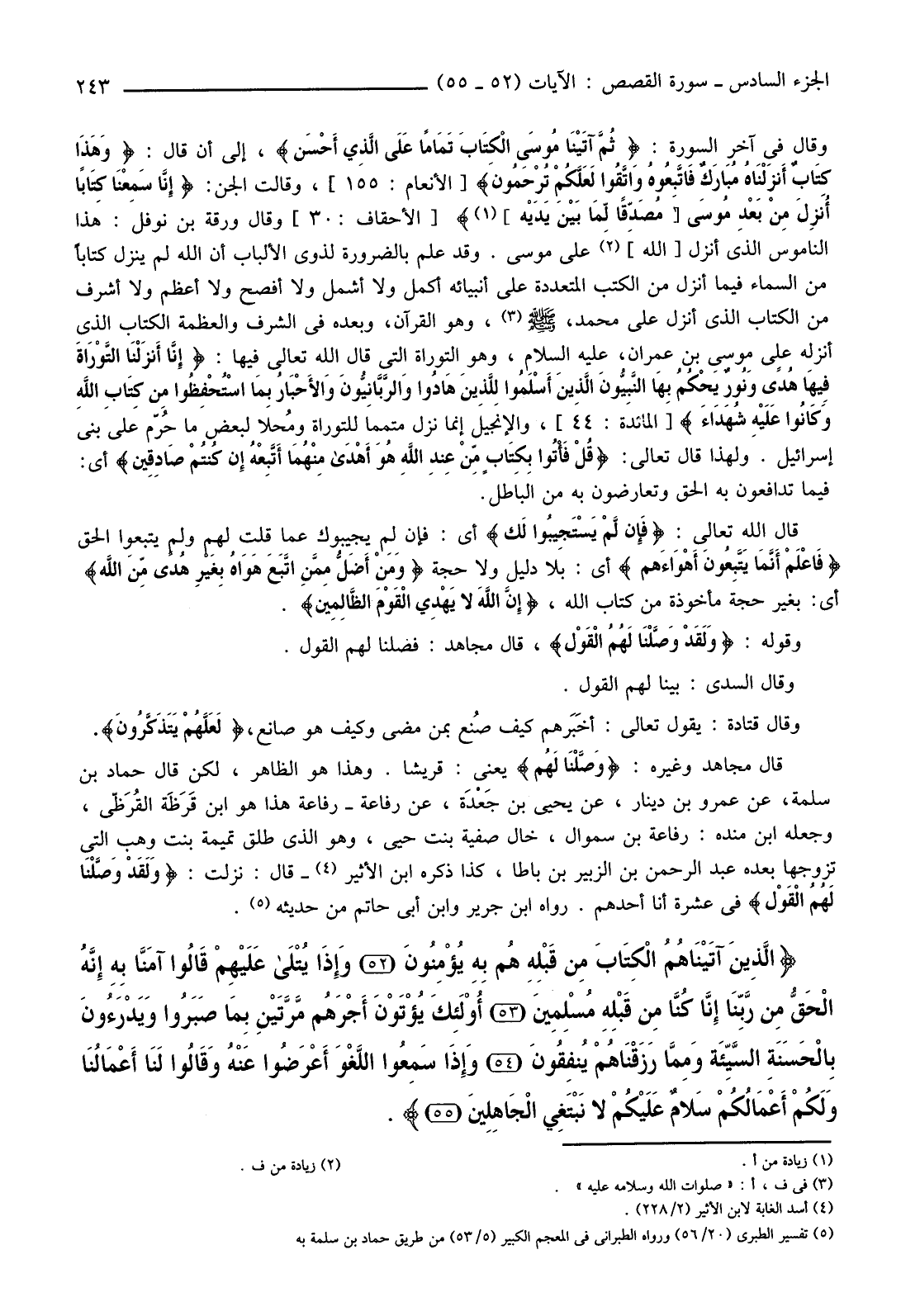 {الَّذِينَ آتَيْنَاهُمُ الْكِتَابَ مِنْ قَبْلِهِ هُمْ بِهِ يُؤْمِنُونَ (52) وَإِذَا يُتْلَى عَلَيْهِمْ قَالُوا آمَنَّا بِهِ إِنَّهُ الْحَقُّ مِنْ رَبِّنَا إِنَّا كُنَّا مِنْ قَبْلِهِ مُسْلِمِينَ (53) أُولَئِكَ يُؤْتَوْنَ أَجْرَهُمْ مَرَّتَيْنِ بِمَا صَبَرُوا وَيَدْرَءُونَ بِالْحَسَنَةِ السَّيِّئَةَ وَمِمَّا رَزَقْنَاهُمْ يُنْفِقُونَ (54) وَإِذَا سَمِعُوا اللَّغْوَ أَعْرَضُوا عَنْهُ وَقَالُوا لَنَا أَعْمَالُنَا وَلَكُمْ أَعْمَالُكُمْ سَلامٌ عَلَيْكُمْ لَا نَبْتَغِي الْجَاهِلِينَ (55) } .