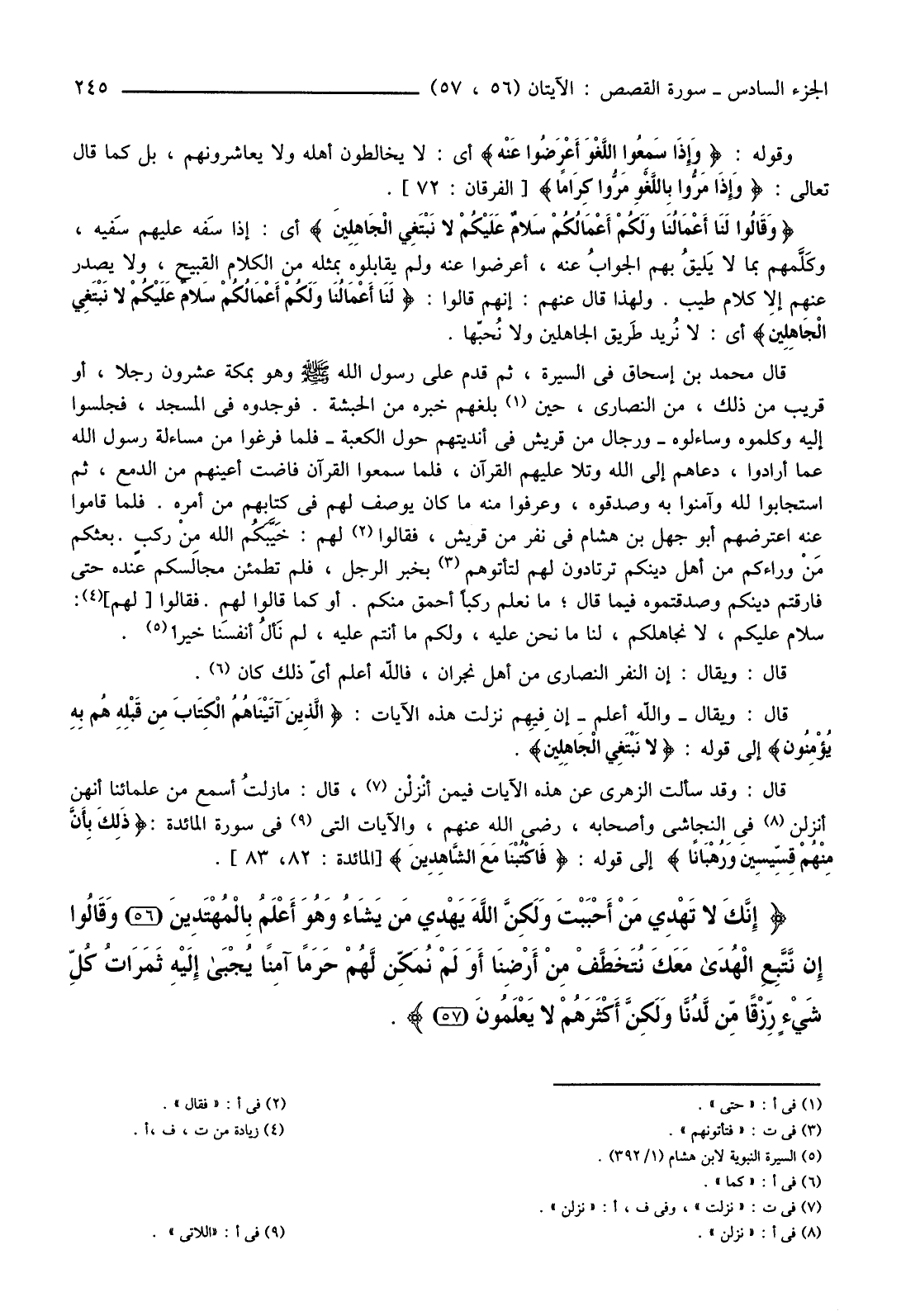 قَالَ: وَيُقَالُ -وَاللَّهُ أَعْلَمُ -إِنَّ فِيهِمْ نَزَلَتْ هَذِهِ الْآيَاتُ: {الَّذِينَ آتَيْنَاهُمُ الْكِتَابَ مِنْ قَبْلِهِ هُمْ بِهِ يُؤْمِنُونَ} إِلَى قَوْلِهِ: {لَا نَبْتَغِي الْجَاهِلِينَ} .