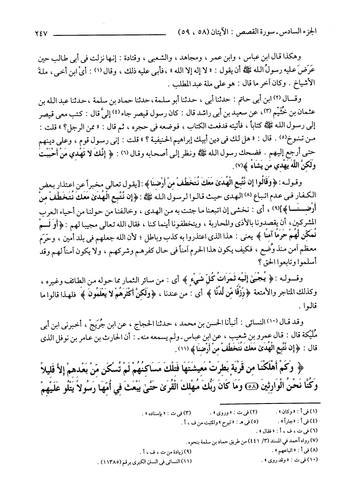 وَقَوْلُهُ: {وَقَالُوا إِنْ نَتَّبِعِ الْهُدَى مَعَكَ نُتَخَطَّفْ مِنْ أَرْضِنَا} : [يَقُولُ تَعَالَى مُخْبِرًا عَنِ اعْتِذَارِ بَعْضِ الْكُفَّارِ فِي عَدَمِ اتِّبَاعِ (8) الْهُدَى حَيْثُ قَالُوا لِرَسُولِ اللَّهِ صَلَّى اللَّهُ عَلَيْهِ وَسَلَّمَ: {إِنْ نَتَّبِعِ الْهُدَى مَعَكَ نُتَخَطَّفْ مِنْ أَرْضِنَا} ] (9) أَيْ: نَخْشَى إِنِ اتَّبَعْنَا مَا جِئْتَ بِهِ مِنَ الْهُدَى، وَخَالَفْنَا مَنْ حَوْلَنَا مِنْ أَحْيَاءِ الْعَرَبِ الْمُشْرِكِينَ، أَنْ يَقْصِدُونَا بِالْأَذَى وَالْمُحَارَبَةِ، وَيَتَخَطَّفُونَا أَيْنَمَا كُنَّا، فَقَالَ اللَّهُ تَعَالَى مُجِيبًا لَهُمْ: {أَوَلَمْ نُمَكِّنْ لَهُمْ حَرَمًا آمِنًا} يَعْنِي: هَذَا الَّذِي اعْتَذَرُوا بِهِ كَذِبٌ وَبَاطِلٌ؛ لِأَنَّ اللَّهَ جَعَلَهُمْ فِي بَلَدٍ أَمِينٍ، وحَرَم مُعَظَّمٍ آمِنٍ مُنْذُ وُضع، فَكَيْفَ يَكُونُ هَذَا الْحَرَمُ آمِنًا فِي حَالِ كَفْرِهِمْ وَشِرْكِهِمْ، وَلَا يَكُونُ آمِنًا لَهُمْ وَقَدْ أَسْلَمُوا وَتَابَعُوا الْحَقَّ؟.