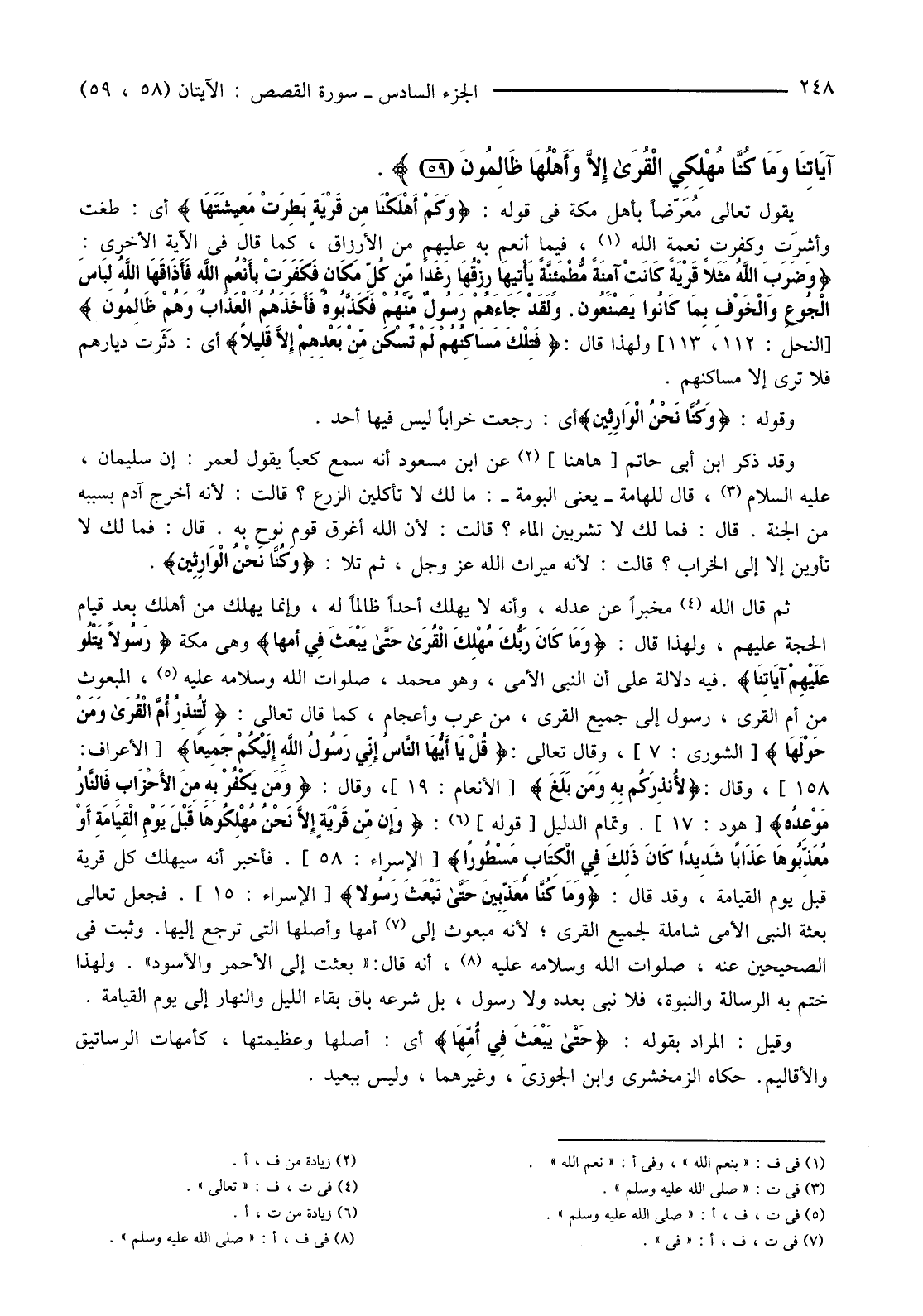 ثُمَّ قَالَ اللَّهُ (4) مُخْبِرًا عَنْ عَدْلِهِ، وَأَنَّهُ لَا يُهْلِكُ أَحَدًا ظَالِمًا لَهُ، وَإِنَّمَا يُهْلِكُ مَنْ أَهْلَكَ بَعْدَ قِيَامِ الْحُجَّةِ عَلَيْهِمْ، وَلِهَذَا قَالَ: {وَمَا كَانَ رَبُّكَ مُهْلِكَ الْقُرَى حَتَّى يَبْعَثَ فِي أُمِّهَا} وَهِيَ مَكَّةُ {رَسُولا يَتْلُو عَلَيْهِمْ آيَاتِنَا} . فِيهِ دَلَالَةٌ عَلَى أَنَّ النَّبِيَّ الْأُمِّيَّ، وَهُوَ مُحَمَّدٌ، صَلَوَاتُ اللَّهِ وَسَلَامُهُ عَلَيْهِ (5) ، الْمَبْعُوثَ مِنْ أُمِّ الْقُرَى، رَسُولٌ إِلَى جَمِيعِ الْقُرَى، مِنْ عَرَبٍ وَأَعْجَامٍ، كَمَا قَالَ تَعَالَى: {لِتُنْذِرَ أُمَّ الْقُرَى وَمَنْ حَوْلَهَا} [الشُّورَى: 7] ، وَقَالَ تَعَالَى: {قُلْ يَا أَيُّهَا النَّاسُ إِنِّي رَسُولُ اللَّهِ إِلَيْكُمْ جَمِيعًا} [الْأَعْرَافِ: 158] ، وَقَالَ: {لأنْذِرَكُمْ بِهِ وَمَنْ بَلَغَ} [الْأَنْعَامِ: 19] ، وَقَالَ: {وَمَنْ يَكْفُرْ بِهِ مِنَ الأحْزَابِ فَالنَّارُ مَوْعِدُهُ} [هُودٍ: 17] . وَتَمَامُ الدَّلِيلِ [قَوْلُهُ] (6) {وَإِنْ مِنْ قَرْيَةٍ إِلا نَحْنُ مُهْلِكُوهَا قَبْلَ يَوْمِ الْقِيَامَةِ أَوْ مُعَذِّبُوهَا عَذَابًا شَدِيدًا كَانَ ذَلِكَ فِي الْكِتَابِ مَسْطُورًا} [الْإِسْرَاءِ: 58] . فَأَخْبَرَ أَنَّهُ سَيُهْلِكُ كُلَّ قَرْيَةٍ قَبْلَ يَوْمِ الْقِيَامَةِ، وَقَدْ قَالَ: {وَمَا كُنَّا مُعَذِّبِينَ حَتَّى نَبْعَثَ رَسُولا} [الْإِسْرَاءِ: 15] . فَجَعَلَ تَعَالَى بِعْثَةَ النَّبِيِّ الْأُمِّيِّ شَامِلَةً لِجَمِيعِ الْقُرَى؛ لِأَنَّهُ مَبْعُوثٌ إِلَى (7) أُمِّهَا وَأَصْلِهَا الَّتِي تَرْجِعُ إِلَيْهَا. وَثَبَتَ فِي الصَّحِيحَيْنِ عَنْهُ، صَلَوَاتُ اللَّهِ وَسَلَامُهُ عَلَيْهِ (8) ، أَنَّهُ قَالَ: "بُعِثْتُ إِلَى الْأَحْمَرِ وَالْأَسْوَدِ". وَلِهَذَا خَتَمَ بِهِ الرِّسَالَةَ وَالنُّبُوَّةَ، فَلَا نَبِيَّ بَعْدَهُ وَلَا رَسُولَ، بَلْ شَرْعُهُ بَاقٍ بَقَاءَ اللَّيْلِ وَالنَّهَارِ إِلَى يَوْمِ الْقِيَامَةِ.