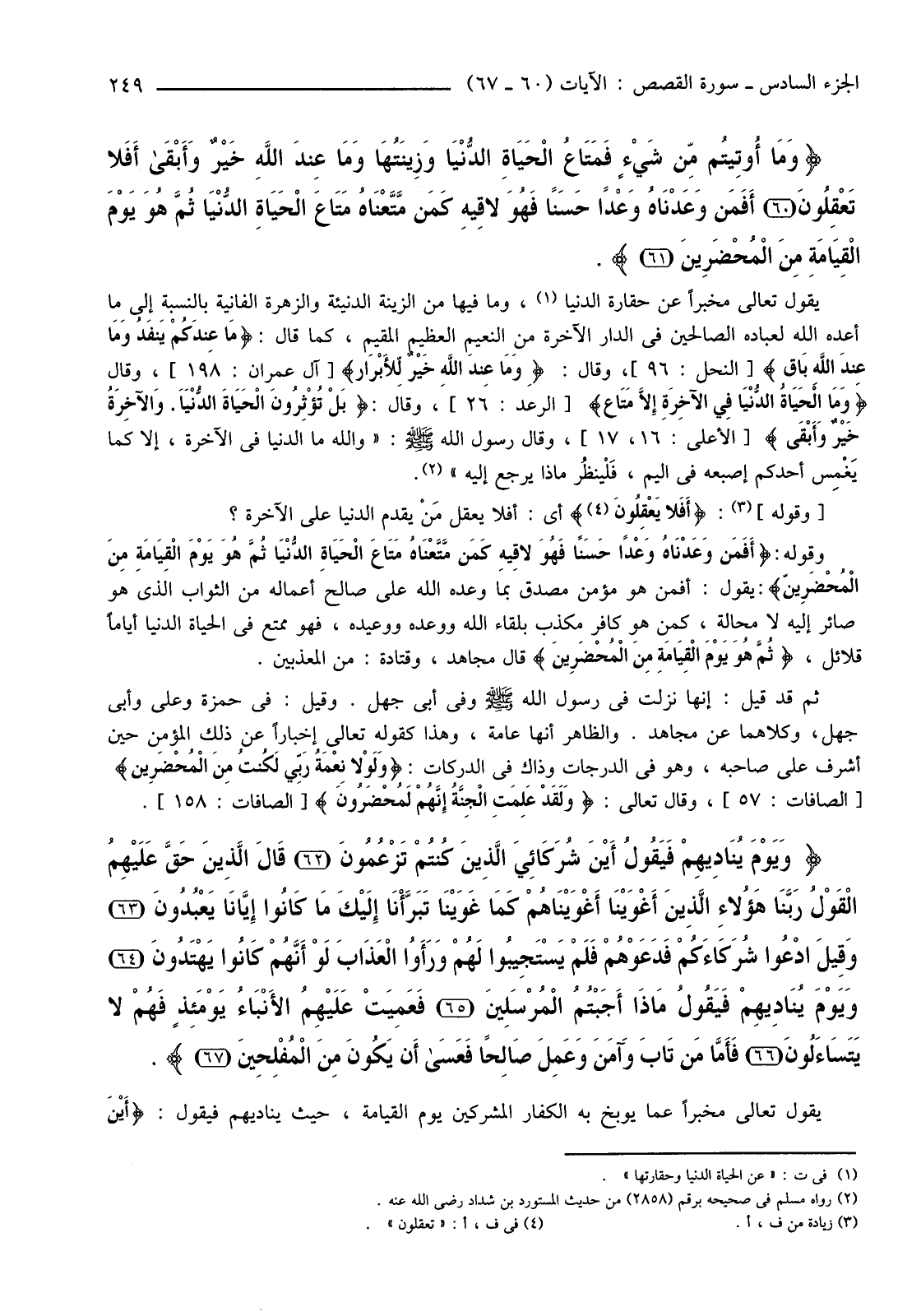 {وَمَا أُوتِيتُمْ مِنْ شَيْءٍ فَمَتَاعُ الْحَيَاةِ الدُّنْيَا وَزِينَتُهَا وَمَا عِنْدَ اللَّهِ خَيْرٌ وَأَبْقَى أَفَلا تَعْقِلُونَ (60) أَفَمَنْ وَعَدْنَاهُ وَعْدًا حَسَنًا فَهُوَ لاقِيهِ كَمَنْ مَتَّعْنَاهُ مَتَاعَ الْحَيَاةِ الدُّنْيَا ثُمَّ هُوَ يَوْمَ الْقِيَامَةِ مِنَ الْمُحْضَرِينَ (61) } .
