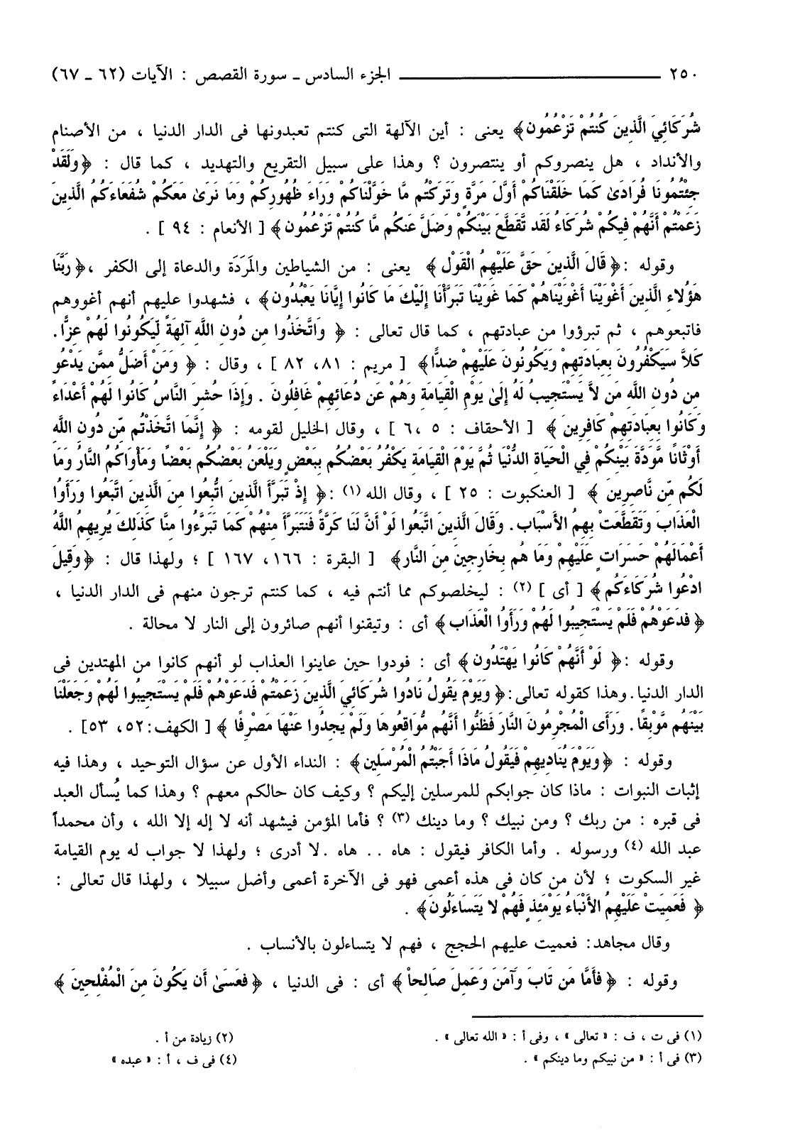 وَقَوْلُهُ: {قَالَ الَّذِينَ حَقَّ عَلَيْهِمُ الْقَوْلُ} يَعْنِي: مِنَ الشَّيَاطِينِ والمَرَدَة وَالدُّعَاةِ إِلَى الْكُفْرِ، {رَبَّنَا هَؤُلاءِ الَّذِينَ أَغْوَيْنَا أَغْوَيْنَاهُمْ كَمَا غَوَيْنَا تَبَرَّأْنَا إِلَيْكَ مَا كَانُوا إِيَّانَا يَعْبُدُونَ} ، فَشَهِدُوا عَلَيْهِمْ أَنَّهُمْ أَغْوَوْهُمْ فَاتَّبَعُوهُمْ، ثم تبرؤوا مِنْ عِبَادَتِهِمْ، كَمَا قَالَ تَعَالَى: {وَاتَّخَذُوا مِنْ دُونِ اللَّهِ آلِهَةً لِيَكُونُوا لَهُمْ عِزًّا. كَلا سَيَكْفُرُونَ بِعِبَادَتِهِمْ وَيَكُونُونَ عَلَيْهِمْ ضِدًّا} [مَرْيَمَ: 81، 82] ، وَقَالَ: {وَمَنْ أَضَلُّ مِمَّنْ يَدْعُو مِنْ دُونِ اللَّهِ مَنْ لَا يَسْتَجِيبُ لَهُ إِلَى يَوْمِ الْقِيَامَةِ وَهُمْ عَنْ دُعَائِهِمْ غَافِلُونَ. وَإِذَا حُشِرَ النَّاسُ كَانُوا لَهُمْ أَعْدَاءً وَكَانُوا بِعِبَادَتِهِمْ كَافِرِينَ} [الْأَحْقَافِ: 5، 6] ، وَقَالَ الْخَلِيلُ لِقَوْمِهِ: {إِنَّمَا اتَّخَذْتُمْ مِنْ دُونِ اللَّهِ أَوْثَانًا مَوَدَّةَ بَيْنِكُمْ فِي الْحَيَاةِ الدُّنْيَا ثُمَّ يَوْمَ الْقِيَامَةِ يَكْفُرُ بَعْضُكُمْ بِبَعْضٍ وَيَلْعَنُ بَعْضُكُمْ بَعْضًا وَمَأْوَاكُمُ النَّارُ وَمَا لَكُمْ مِنْ نَاصِرِينَ} [الْعَنْكَبُوتِ: 25] ، وَقَالَ اللَّهُ (1) : {إِذْ تَبَرَّأَ الَّذِينَ اتُّبِعُوا مِنَ الَّذِينَ اتَّبَعُوا وَرَأَوُا الْعَذَابَ وَتَقَطَّعَتْ بِهِمُ الأسْبَابُ وَقَالَ الَّذِينَ اتَّبَعُوا لَوْ أَنَّ لَنَا كَرَّةً فَنَتَبَرَّأَ مِنْهُمْ كَمَا تَبَرَّءُوا مِنَّا كَذَلِكَ يُرِيهِمُ اللَّهُ أَعْمَالَهُمْ حَسَرَاتٍ عَلَيْهِمْ وَمَا هُمْ بِخَارِجِينَ مِنَ النَّارِ} [الْبَقَرَةِ: 166، 167] ، وَلِهَذَا قَالَ: {وَقِيلَ ادْعُوا شُرَكَاءَكُمْ} [أَيْ] (2) : لِيُخَلِّصُوكُمْ مِمَّا أَنْتُمْ فِيهِ، كَمَا كُنْتُمْ تَرْجُونَ مِنْهُمْ فِي الدَّارِ الدُّنْيَا، {فَدَعَوْهُمْ فَلَمْ يَسْتَجِيبُوا لَهُمْ وَرَأَوُا الْعَذَابَ} أَيْ: وَتَيَقَّنُوا أَنَّهُمْ صَائِرُونَ إِلَى النَّارِ لَا مَحَالَةَ.