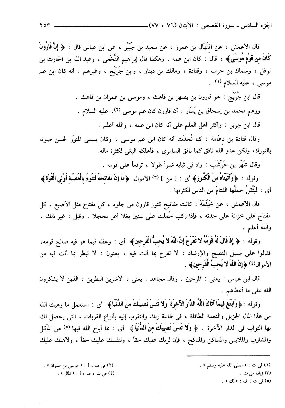 وَقَوْلُهُ: {إِذْ قَالَ لَهُ قَوْمُهُ لا تَفْرَحْ إِنَّ اللَّهَ لا يُحِبُّ الْفَرِحِينَ} أَيْ: وَعَظَهُ فِيمَا هُوَ فِيهِ صَالِحُ قَوْمِهِ، فَقَالُوا عَلَى سَبِيلِ النُّصْحِ وَالْإِرْشَادِ: لَا تَفْرَحْ بِمَا أَنْتَ فِيهِ، يَعْنُونَ: لَا تَبْطَرْ بِمَا أَنْتَ فِيهِ مِنَ الْأَمْوَالِ (4) {إِنَّ اللَّهَ لَا يُحِبُّ الْفَرِحِينَ} قَالَ ابْنُ عَبَّاسٍ: يَعْنِي الْمَرِحِينَ. وَقَالَ مُجَاهِدٌ: يَعْنِي الْأَشِرِينَ الْبَطِرِينَ، الَّذِينَ لَا يَشْكُرُونَ اللَّهَ عَلَى مَا أَعْطَاهُمْ.