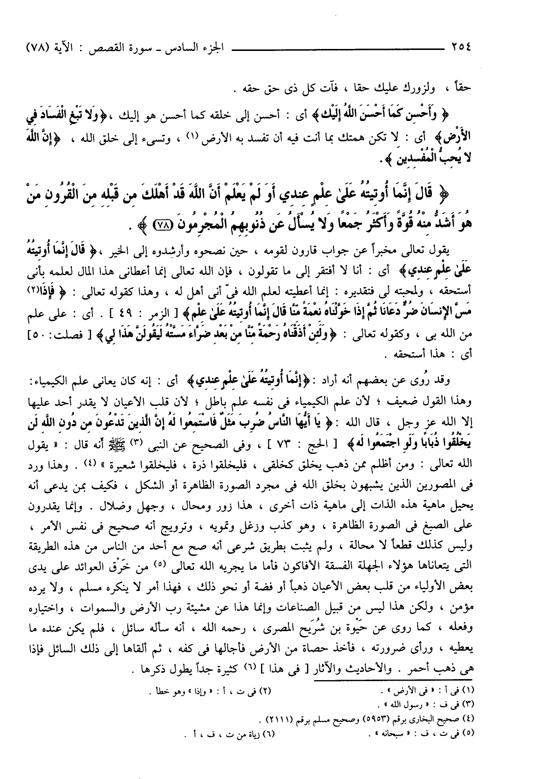 وَقَدْ رُوي عَنْ بَعْضِهِمْ أَنَّهُ أَرَادَ: {إِنَّمَا أُوتِيتُهُ عَلَى عِلْمٍ عِنْدِي} أَيْ: إِنَّهُ كَانَ يُعَانِي عِلْمَ الْكِيمْيَاءِ: وَهَذَا الْقَوْلُ ضَعِيفٌ؛ لِأَنَّ عِلْمَ الْكِيمْيَاءِ فِي نَفْسِهِ عِلْمٌ بَاطِلٌ؛ لِأَنَّ قَلْبَ الْأَعْيَانِ لَا يَقْدِرُ أَحَدٌ عَلَيْهَا إِلَّا اللَّهُ عَزَّ وَجَلَّ، قَالَ اللَّهُ: {يَا أَيُّهَا النَّاسُ ضُرِبَ مَثَلٌ فَاسْتَمِعُوا لَهُ إِنَّ الَّذِينَ تَدْعُونَ مِنْ دُونِ اللَّهِ لَنْ يَخْلُقُوا ذُبَابًا وَلَوِ اجْتَمَعُوا لَهُ} [الْحَجِّ: 73] ، وَفِي الصَّحِيحِ عَنِ النَّبِيِّ (2) صَلَّى اللَّهُ عَلَيْهِ وَسَلَّمَ أَنَّهُ قَالَ: "يَقُولُ اللَّهُ تَعَالَى: ومَنْ أَظْلَمُ مِمَّنْ ذَهَبَ يَخْلُقُ كَخَلْقِي، فَلْيَخْلُقُوا ذَرَّةً، فَلْيَخْلُقُوا شُعَيْرَةً" (3) . وَهَذَا وَرَدَ فِي الْمُصَوِّرِينَ الَّذِينَ يُشَبِّهُونَ بِخَلْقِ اللَّهِ فِي مُجَرَّدِ الصُّورَةِ الظَّاهِرَةِ أَوِ الشَّكْلِ، فَكَيْفَ بِمَنْ يَدَّعِي أَنَّهُ يُحِيلُ مَاهِيَّةَ هَذِهِ الذَّاتِ إِلَى مَاهِيَّةِ ذَاتٍ أُخْرَى، هَذَا زُورٌ وَمُحَالٌ، وَجَهْلٌ وَضَلَالٌ. وَإِنَّمَا يَقْدِرُونَ عَلَى الصَّبْغِ فِي الصُّورَةِ الظَّاهِرَةِ، وَهُوَ كَذِبٌ وَزَغَلٌ وَتَمْوِيهٌ، وَتَرْوِيجٌ أَنَّهُ صَحِيحٌ فِي نَفْسِ الْأَمْرِ، وَلَيْسَ كَذَلِكَ قَطْعًا لَا مَحَالَةَ، وَلَمْ يَثْبُتْ بِطَرِيقٍ شَرْعِيٍّ أَنَّهُ صَحَّ مَعَ أَحَدٍ مِنَ النَّاسِ مِنْ هَذِهِ الطَّرِيقَةِ الَّتِي يَتَعَانَاهَا هَؤُلَاءِ الْجَهَلَةُ الْفَسَقَةُ الْأَفَّاكُونَ فَأَمَّا مَا يُجْرِيهِ اللَّهُ تَعَالَى (4) مِنْ خَرْق الْعَوَائِدِ عَلَى يَدَيْ بَعْضِ الْأَوْلِيَاءِ مِنْ قَلْبِ بَعْضِ الْأَعْيَانِ ذَهَبًا أَوْ فِضَّةً أَوْ نَحْوَ ذَلِكَ، فَهَذَا أَمْرٌ لَا يُنْكِرُهُ مُسْلِمٌ، وَلَا يَرُدُّهُ مُؤْمِنٌ، وَلَكِنَّ هَذَا لَيْسَ مِنْ قَبِيلِ الصِّنَاعَاتِ وَإِنَّمَا هَذَا عَنْ مَشِيئَةِ رَبِّ الْأَرْضِ وَالسَّمَوَاتِ، وَاخْتِيَارِهِ وَفِعْلِهِ، كَمَا رُوِيَ عَنْ حَيْوة بْنِ شُرَيح الْمِصْرِيِّ، رَحِمَهُ اللَّهُ، أَنَّهُ سَأَلَهُ سَائِلٌ، فَلَمْ يَكُنْ عِنْدَهُ مَا يُعْطِيهِ، وَرَأَى ضَرُورَتَهُ، فَأَخَذَ حَصَاةً مِنَ الْأَرْضِ فَأَجَالَهَا فِي كَفِّهِ، ثُمَّ أَلْقَاهَا إِلَى ذَلِكَ السَّائِلِ فَإِذَا هِيَ ذَهَبٌ أَحْمَرُ. وَالْأَحَادِيثُ وَالْآثَارُ [فِي هَذَا] (5) كَثِيرَةٌ جِدًّا يطول ذكرها.