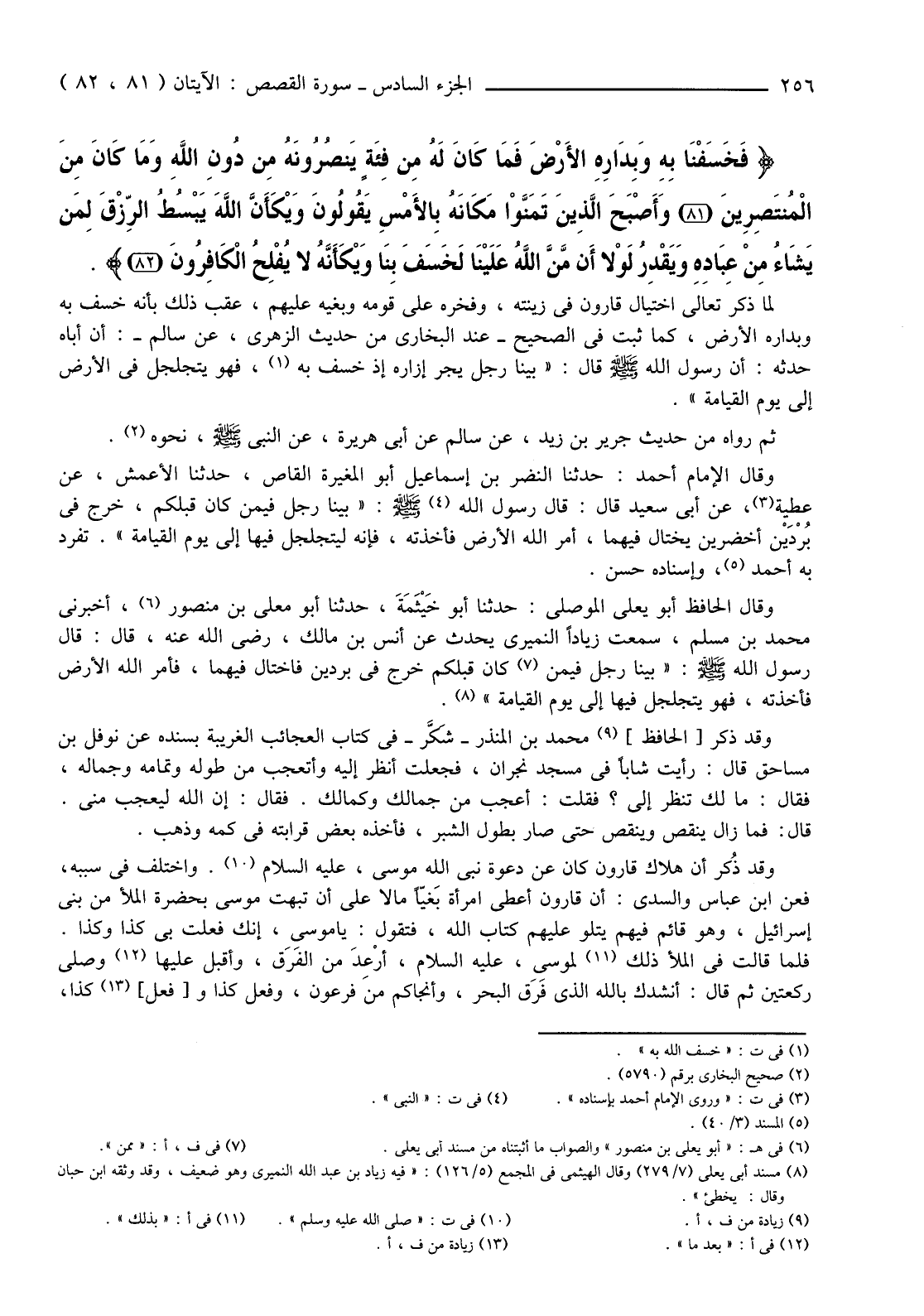 لَمَّا ذَكَرَ تَعَالَى اخْتِيَالَ قَارُونَ فِي زِينَتِهِ، وَفَخْرَهُ عَلَى قَوْمِهِ وَبَغْيَهُ عَلَيْهِمْ، عَقَّبَ ذَلِكَ بِأَنَّهُ خَسَفَ بِهِ وَبِدَارِهِ الْأَرْضَ، كَمَا ثَبَتَ فِي الصَّحِيحِ -عِنْدَ الْبُخَارِيِّ مِنْ حَدِيثِ الزُّهْرِيِّ، عَنْ سَالِمٍ -أَنَّ أَبَاهُ حَدَّثَهُ: أَنَّ رَسُولَ اللَّهِ صَلَّى اللَّهُ عَلَيْهِ وَسَلَّمَ قَالَ: "بَيْنَا رَجُلٌ يَجُرُّ إِزَارَهُ إِذْ خُسِفَ بِهِ (1) ، فَهُوَ يَتَجَلْجَلُ فِي الْأَرْضِ إِلَى يَوْمِ الْقِيَامَةِ".
