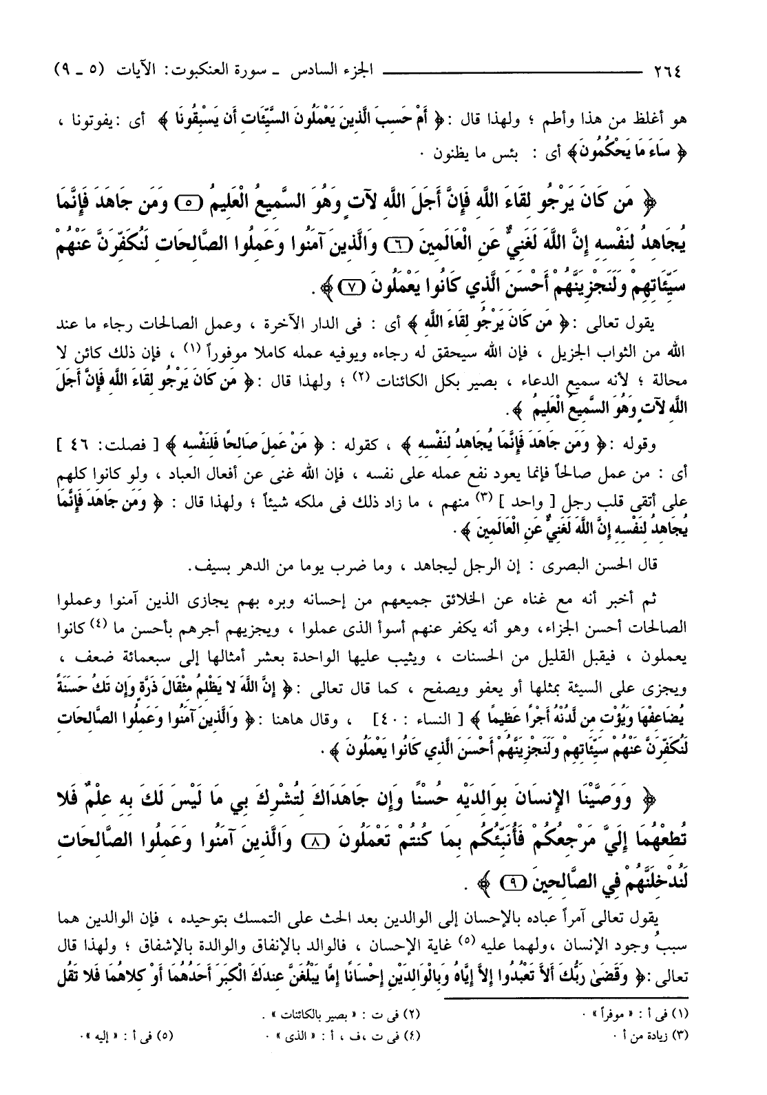 {وَوَصَّيْنَا الإنْسَانَ بِوَالِدَيْهِ حُسْنًا وَإِنْ جَاهَدَاكَ لِتُشْرِكَ بِي مَا لَيْسَ لَكَ بِهِ عِلْمٌ فَلا تُطِعْهُمَا إِلَيَّ مَرْجِعُكُمْ فَأُنَبِّئُكُمْ بِمَا كُنْتُمْ تَعْمَلُونَ (8) وَالَّذِينَ آمَنُوا وَعَمِلُوا الصَّالِحَاتِ لَنُدْخِلَنَّهُمْ فِي الصَّالِحِينَ (9) } .