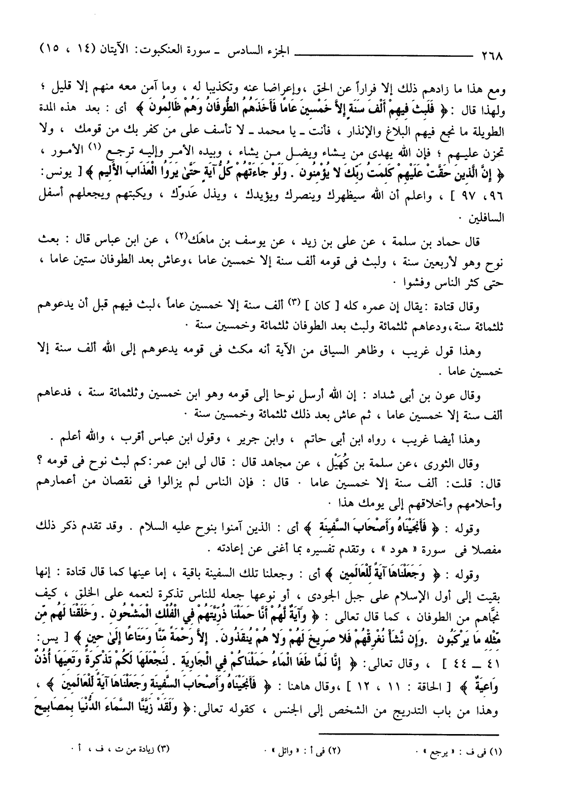 وَقَالَ قَتَادَةُ: يُقَالُ إِنَّ عُمُرَهُ كُلَّهُ [كَانَ] (3) أَلْفَ سَنَةٍ إِلَّا خَمْسِينَ عَامًا، لَبِثَ فِيهِمْ قَبْلَ أَنْ يَدْعُوَهُمْ ثَلَثَمِائَةِ سَنَةٍ، وَدَعَاهُمْ ثَلَثَمِائَةٍ وَلَبِثَ بَعْدَ الطُّوفَانِ ثَلَثَمِائَةٍ وَخَمْسِينَ سَنَةً.