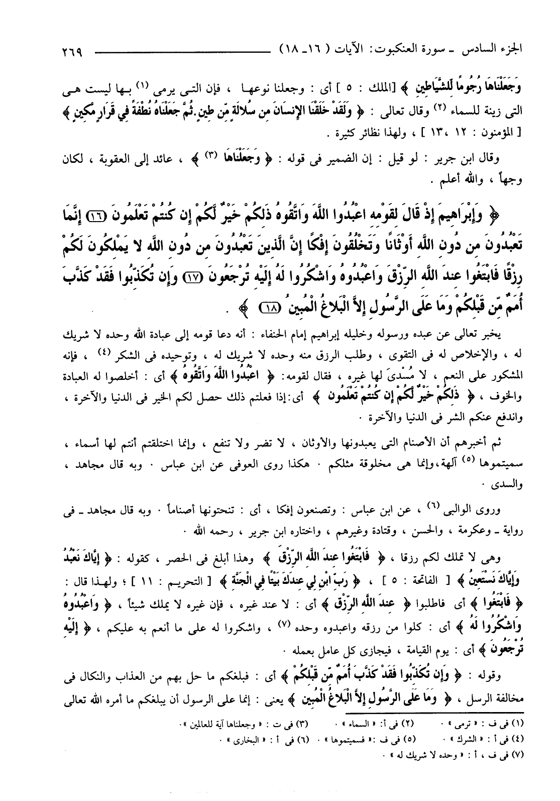 {وَإِبْرَاهِيمَ إِذْ قَالَ لِقَوْمِهِ اعْبُدُوا اللَّهَ وَاتَّقُوهُ ذَلِكُمْ خَيْرٌ لَكُمْ إِنْ كُنْتُمْ تَعْلَمُونَ (16) إِنَّمَا تَعْبُدُونَ مِنْ دُونِ اللَّهِ أَوْثَانًا وَتَخْلُقُونَ إِفْكًا إِنَّ الَّذِينَ تَعْبُدُونَ مِنْ دُونِ اللَّهِ لَا يَمْلِكُونَ لَكُمْ رِزْقًا فَابْتَغُوا عِنْدَ اللَّهِ الرِّزْقَ وَاعْبُدُوهُ وَاشْكُرُوا لَهُ إِلَيْهِ تُرْجَعُونَ (17) وَإِنْ تُكَذِّبُوا فَقَدْ كَذَّبَ أُمَمٌ مِنْ قَبْلِكُمْ وَمَا عَلَى الرَّسُولِ إِلا الْبَلاغُ الْمُبِينُ (18) } .