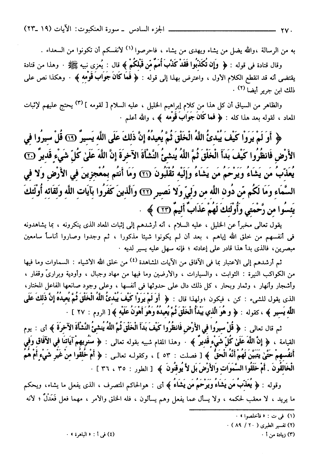 {أَوَلَمْ يَرَوْا كَيْفَ يُبْدِئُ اللَّهُ الْخَلْقَ ثُمَّ يُعِيدُهُ إِنَّ ذَلِكَ عَلَى اللَّهِ يَسِيرٌ (19) قُلْ سِيرُوا فِي الأرْضِ فَانْظُرُوا كَيْفَ بَدَأَ الْخَلْقَ ثُمَّ اللَّهُ يُنْشِئُ النَّشْأَةَ الآخِرَةَ إِنَّ اللَّهَ عَلَى كُلِّ شَيْءٍ قَدِيرٌ (20) يُعَذِّبُ مَنْ يَشَاءُ وَيَرْحَمُ مَنْ يَشَاءُ وَإِلَيْهِ تُقْلَبُونَ (21) وَمَا أَنْتُمْ بِمُعْجِزِينَ فِي الأرْضِ وَلا فِي السَّمَاءِ وَمَا لَكُمْ مِنْ دُونِ اللَّهِ مِنْ وَلِيٍّ وَلا نَصِيرٍ (22) وَالَّذِينَ كَفَرُوا بِآيَاتِ اللَّهِ وَلِقَائِهِ أُولَئِكَ يَئِسُوا مِنْ رَحْمَتِي وَأُولَئِكَ لَهُمْ عَذَابٌ أَلِيمٌ (23) } .