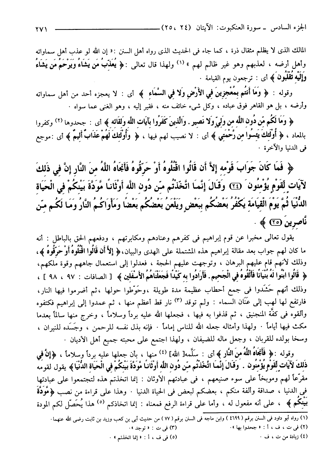 {فَمَا كَانَ جَوَابَ قَوْمِهِ إِلا أَنْ قَالُوا اقْتُلُوهُ أَوْ حَرِّقُوهُ فَأَنْجَاهُ اللَّهُ مِنَ النَّارِ إِنَّ فِي ذَلِكَ لآيَاتٍ لِقَوْمٍ يُؤْمِنُونَ (24) وَقَالَ إِنَّمَا اتَّخَذْتُمْ مِنْ دُونِ اللَّهِ أَوْثَانًا مَوَدَّةَ بَيْنِكُمْ فِي الْحَيَاةِ الدُّنْيَا ثُمَّ يَوْمَ الْقِيَامَةِ يَكْفُرُ بَعْضُكُمْ بِبَعْضٍ وَيَلْعَنُ بَعْضُكُمْ بَعْضًا وَمَأْوَاكُمُ النَّارُ وَمَا لَكُمْ مِنْ نَاصِرِينَ (25) } .