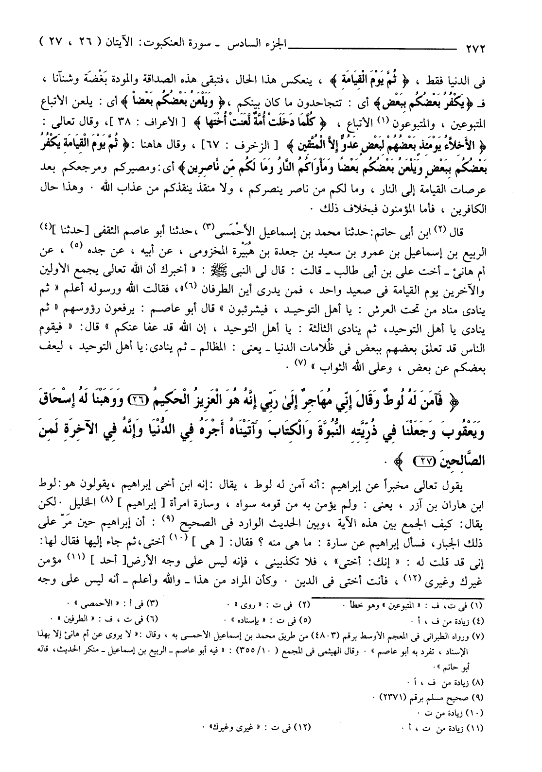 يَقُولُ تَعَالَى مُخْبِرًا عَنْ إِبْرَاهِيمَ: أَنَّهُ آمَنُ لَهُ لُوطٌ، يُقَالُ: إِنَّهُ ابْنُ أَخِي إِبْرَاهِيمَ، يَقُولُونَ هُوَ: لُوطُ بْنُ هَارَانَ بْنِ آزَرَ، يَعْنِي: وَلَمْ يُؤْمِنْ بِهِ مِنْ قَوْمِهِ سِوَاهُ، وَسَارَّةُ امْرَأَةُ [إِبْرَاهِيمَ] (8) الْخَلِيلِ. لَكِنْ يُقَالُ: كَيْفَ الْجَمْعُ بَيْنَ هَذِهِ الْآيَةِ، وَبَيْنَ الْحَدِيثِ الْوَارِدِ فِي الصَّحِيحِ (9) : أَنَّ إِبْرَاهِيمَ حِينَ مَرّ عَلَى ذَلِكَ الْجَبَّارِ، فَسَأَلَ إِبْرَاهِيمَ عَنْ سَارَّةَ: مَا هِيَ مِنْهُ؟ فَقَالَ: [هِيَ] (10) أُخْتِي، ثُمَّ جَاءَ إِلَيْهَا فَقَالَ لَهَا: إِنِّي قَدْ قُلْتُ لَهُ: "إِنَّكِ: أُخْتِي"، فَلَا تُكَذِّبِينِي، فَإِنَّهُ لَيْسَ عَلَى وَجْهِ الْأَرْضِ [أَحَدٌ] (11) مُؤْمِنٌ غَيْرُكِ وَغَيْرِي (12) ، فَأَنْتِ أُخْتِي فِي الدِّينِ. وَكَأَنَّ الْمُرَادَ مِنْ هَذَا -والله أعلم -أنه ليس على وجه