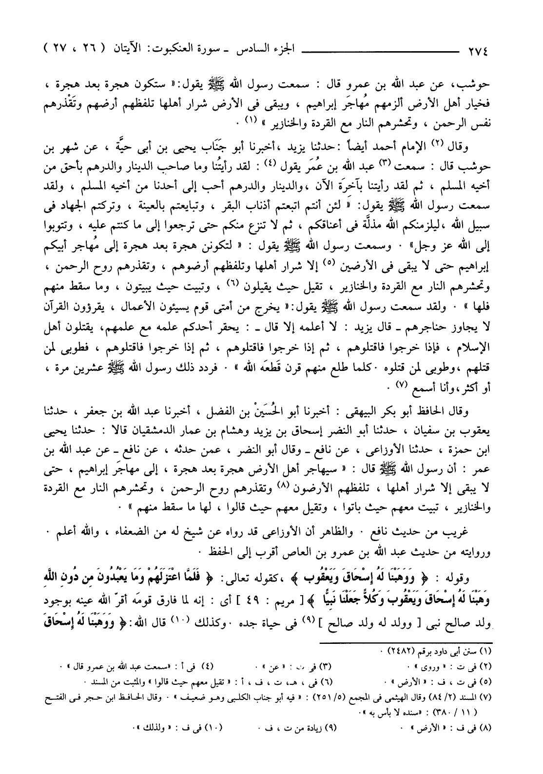 وَقَالَ الْحَافِظُ أَبُو بَكْرٍ الْبَيْهَقِيُّ: أَخْبَرَنَا أَبُو الحُسَيْن بْنُ الْفَضْلٍ، أَخْبَرَنَا عَبْدُ اللَّهِ بْنُ جَعْفَرٍ، حَدَّثَنَا يَعْقُوبُ بْنُ سُفْيَانَ، حَدَّثَنَا أَبُو النَّضْرِ إِسْحَاقُ بْنُ يَزِيدَ وَهِشَامُ بْنُ عَمَّارٍ الدِّمَشْقِيَّانِ قَالَا حَدَّثَنَا يَحْيَى بْنُ حَمْزَةَ، حَدَّثَنَا الْأَوْزَاعِيُّ، عَنْ نَافِعٍ -وَقَالَ أَبُو النَّضْرِ، عَمَّنْ حدَّثه، عَنْ نَافِعٍ -عَنْ عَبْدِ اللَّهِ بْنِ عُمَرَ: أَنَّ رَسُولَ اللَّهِ صلى الله عليه وسلم قَالَ: "سَيُهَاجِرُ أَهْلُ الْأَرْضِ هِجْرَةً بَعْدَ هِجْرَةٍ، إِلَى مهاجَر إِبْرَاهِيمَ، حَتَّى لَا يَبْقَى إِلَّا شَرَارُ أَهْلِهَا، تَلْفِظُهُمُ الْأَرَضُونَ (8) وَتَقْذَرُهُمْ رُوحُ الرَّحْمَنِ، وتحشرهم النار مع القردة والخنازير، تبيت معهم حَيْثُ بَاتُوا، وَتَقِيلُ مَعَهُمْ حَيْثُ قَالُوا، لَهَا مَا سَقَطَ مِنْهُمْ".