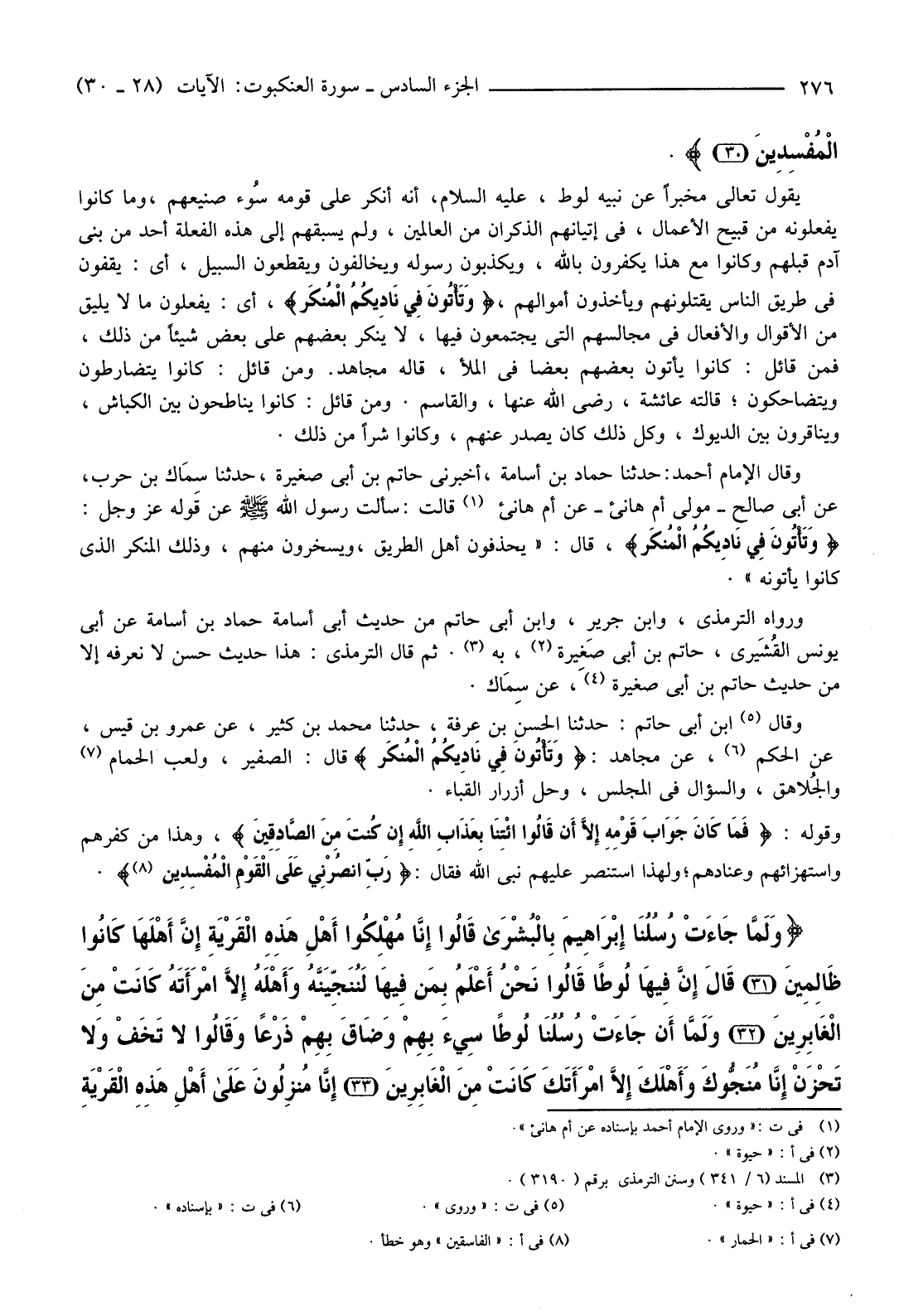 {وَلُوطًا إِذْ قَالَ لِقَوْمِهِ إِنَّكُمْ لَتَأْتُونَ الْفَاحِشَةَ مَا سَبَقَكُمْ بِهَا مِنْ أَحَدٍ مِنَ الْعَالَمِينَ (28) أَئِنَّكُمْ لَتَأْتُونَ الرِّجَالَ وَتَقْطَعُونَ السَّبِيلَ وَتَأْتُونَ فِي نَادِيكُمُ الْمُنْكَرَ فَمَا كَانَ جَوَابَ قَوْمِهِ إِلا أَنْ قَالُوا ائْتِنَا بِعَذَابِ اللَّهِ إِنْ كُنْتَ مِنَ الصَّادِقِينَ (29) قَالَ رَبِّ انْصُرْنِي عَلَى الْقَوْمِ الْمُفْسِدِينَ (30) }