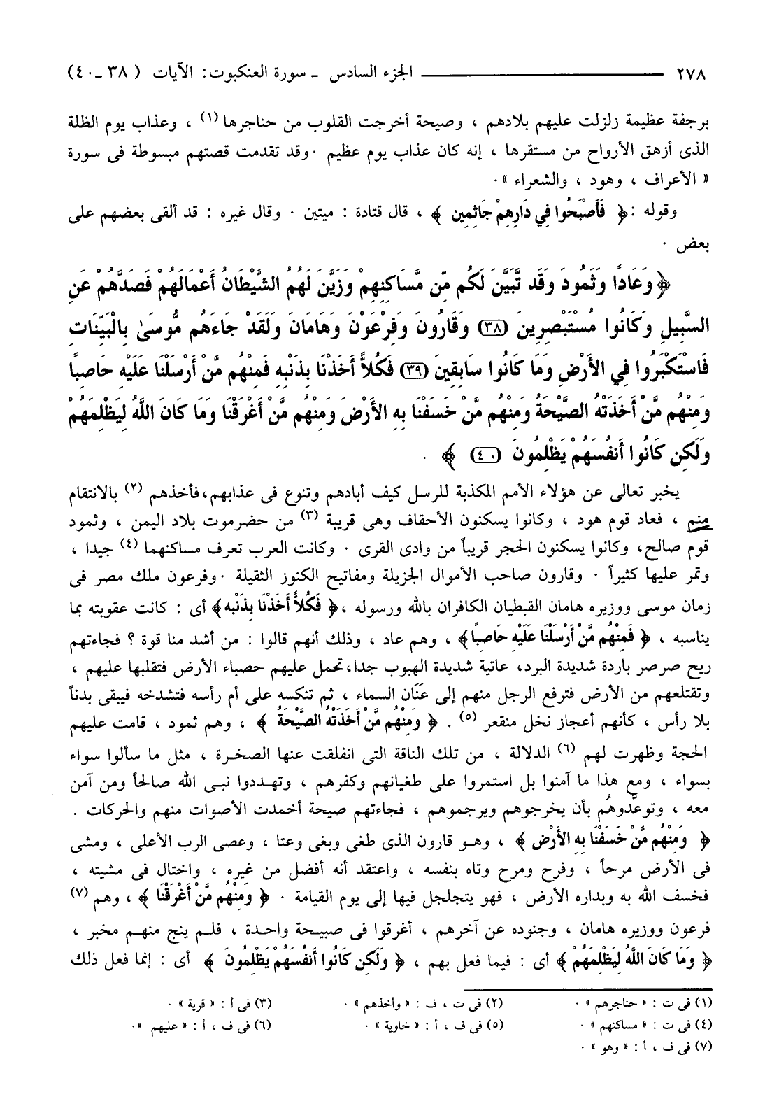 {وَقَارُونَ وَفِرْعَوْنَ وَهَامَانَ وَلَقَدْ جَاءَهُمْ مُوسَى بِالْبَيِّنَاتِ فَاسْتَكْبَرُوا فِي الأرْضِ وَمَا كَانُوا سَابِقِينَ (39) فَكُلا أَخَذْنَا بِذَنْبِهِ فَمِنْهُمْ مَنْ أَرْسَلْنَا عَلَيْهِ حَاصِبًا وَمِنْهُمْ مَنْ أَخَذَتْهُ الصَّيْحَةُ وَمِنْهُمْ مَنْ خَسَفْنَا بِهِ الأرْضَ وَمِنْهُمْ مَنْ أَغْرَقْنَا وَمَا كَانَ اللَّهُ لِيَظْلِمَهُمْ وَلَكِنْ كَانُوا أَنْفُسَهُمْ يَظْلِمُونَ (40) } .