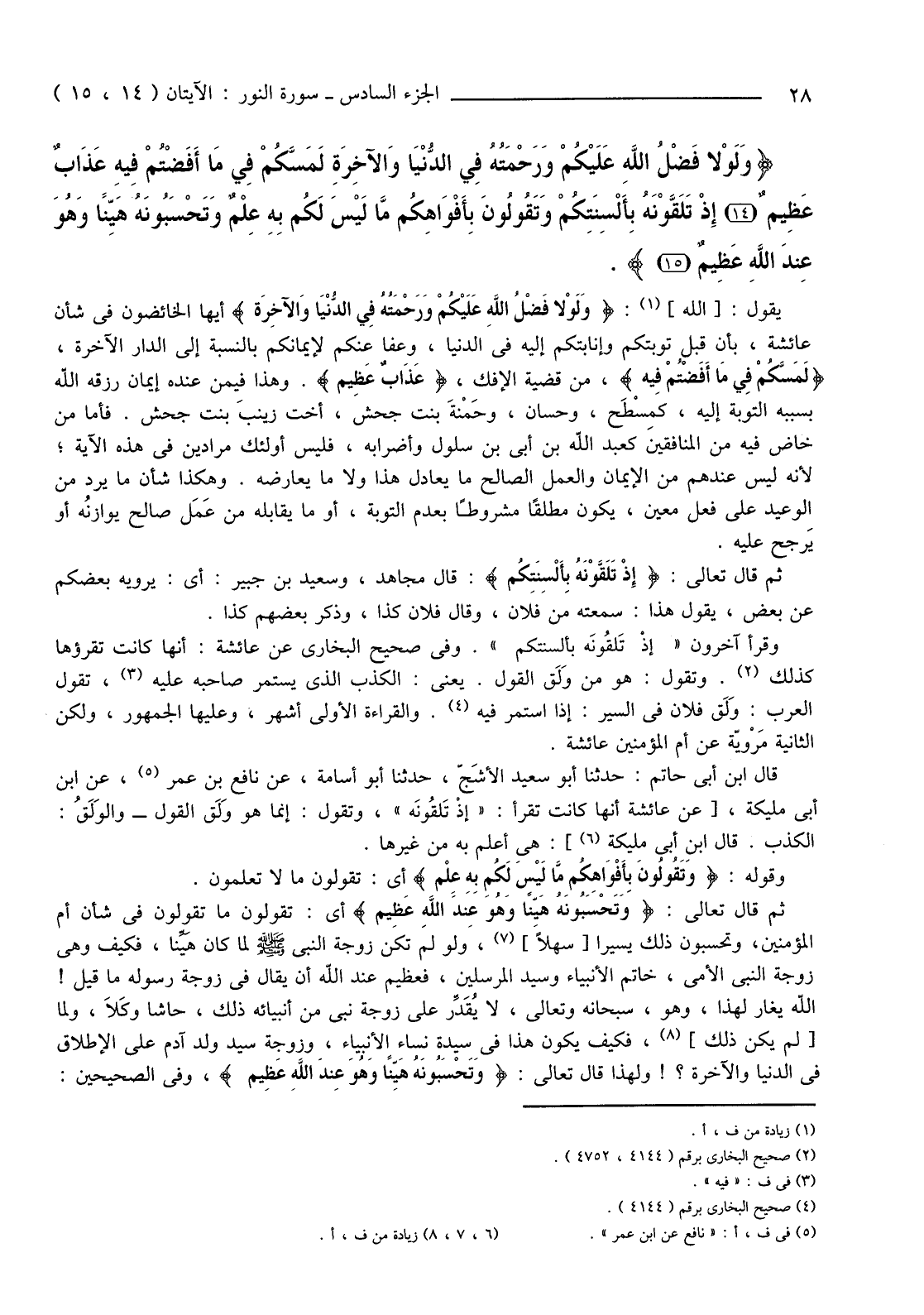 {وَلَوْلا فَضْلُ اللَّهِ عَلَيْكُمْ وَرَحْمَتُهُ فِي الدُّنْيَا وَالآخِرَةِ لَمَسَّكُمْ فِي مَا أَفَضْتُمْ فِيهِ عَذَابٌ عَظِيمٌ (14) إِذْ تَلَقَّوْنَهُ بِأَلْسِنَتِكُمْ وَتَقُولُونَ بِأَفْوَاهِكُمْ مَا لَيْسَ لَكُمْ بِهِ عِلْمٌ وَتَحْسَبُونَهُ هَيِّنًا وَهُوَ عِنْدَ اللَّهِ عَظِيمٌ (15) }