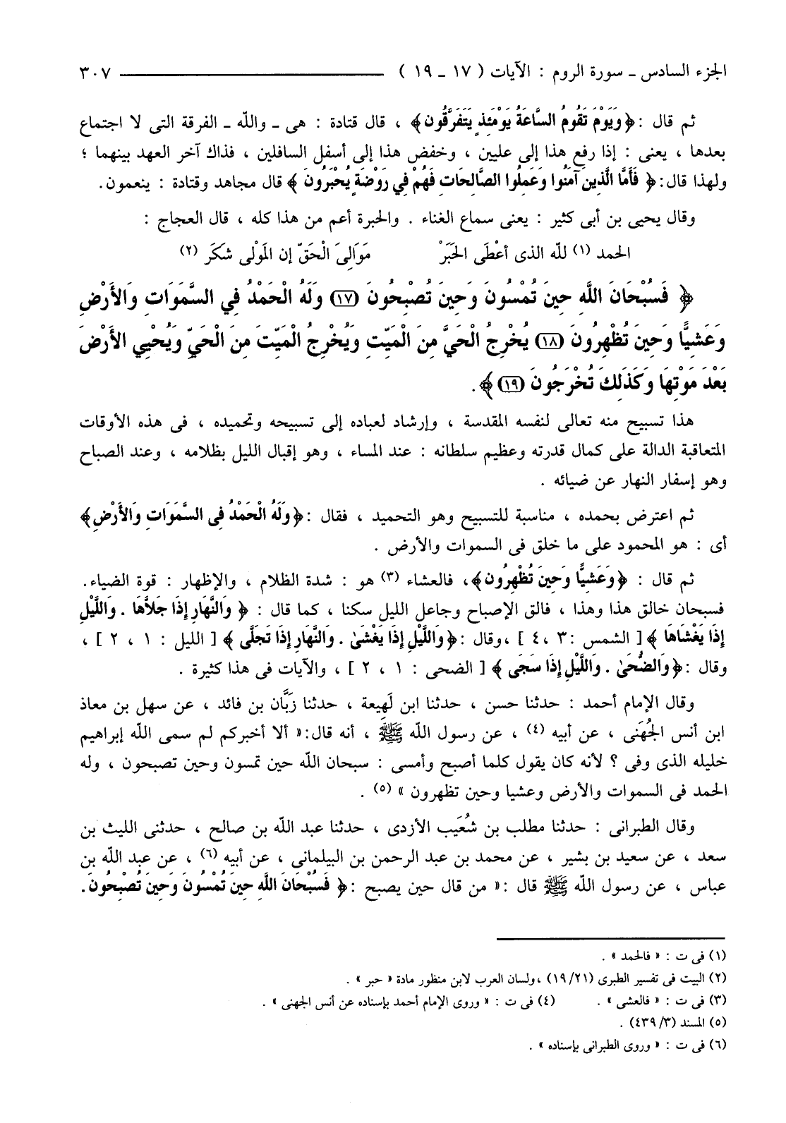 {فَسُبْحَانَ اللَّهِ حِينَ تُمْسُونَ وَحِينَ تُصْبِحُونَ (17) وَلَهُ الْحَمْدُ فِي السَّمَوَاتِ وَالأرْضِ وَعَشِيًّا وَحِينَ تُظْهِرُونَ (18) يُخْرِجُ الْحَيَّ مِنَ الْمَيِّتِ وَيُخْرِجُ الْمَيِّتَ مِنَ الْحَيِّ وَيُحْيِي الأرْضَ بَعْدَ مَوْتِهَا وَكَذَلِكَ تُخْرَجُونَ (19) } .