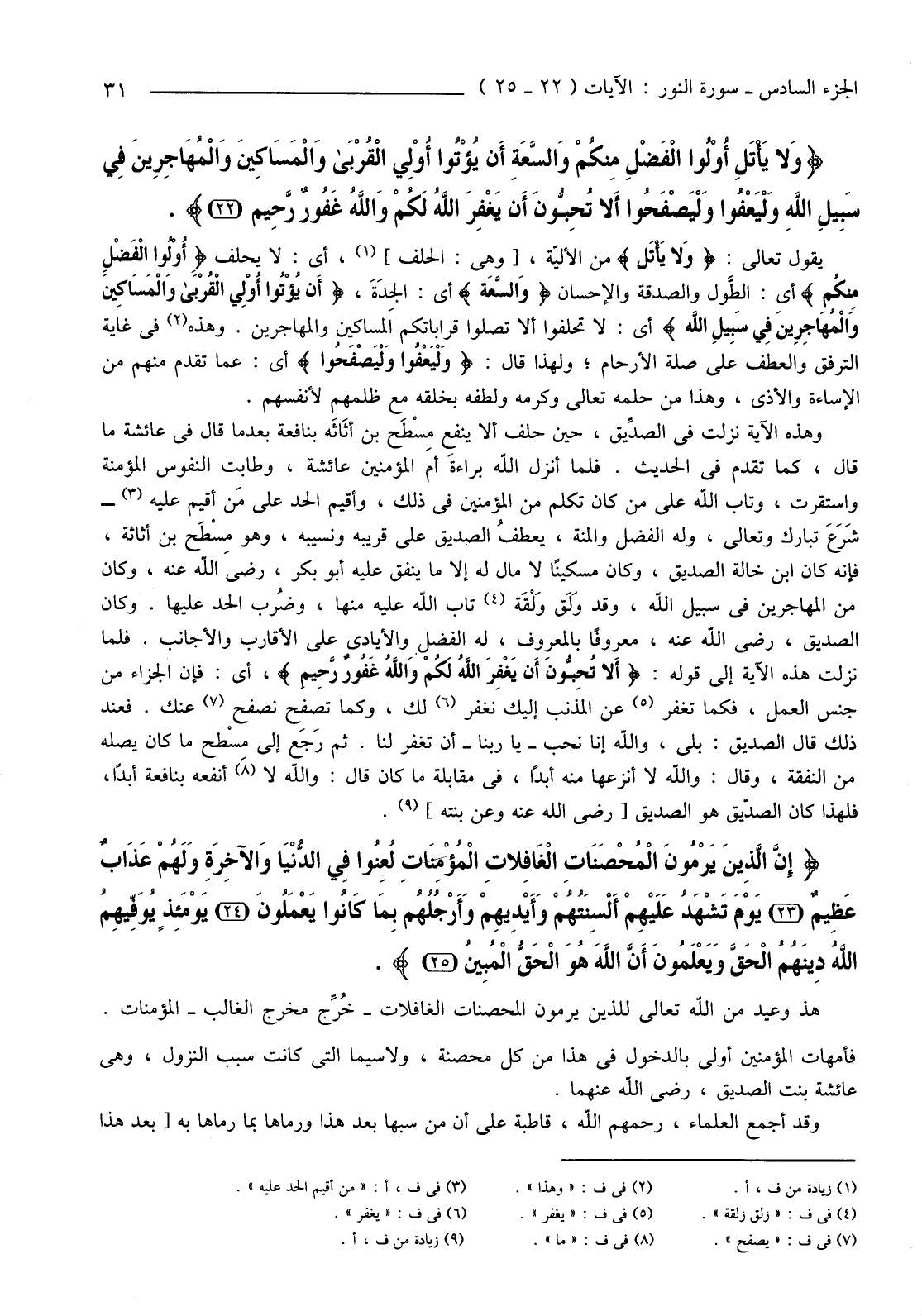 {وَلا يَأْتَلِ أُولُو الْفَضْلِ مِنْكُمْ وَالسَّعَةِ أَنْ يُؤْتُوا أُولِي الْقُرْبَى وَالْمَسَاكِينَ وَالْمُهَاجِرِينَ فِي سَبِيلِ اللَّهِ وَلْيَعْفُوا وَلْيَصْفَحُوا أَلا تُحِبُّونَ أَنْ يَغْفِرَ اللَّهُ لَكُمْ وَاللَّهُ غَفُورٌ رَحِيمٌ (22) }